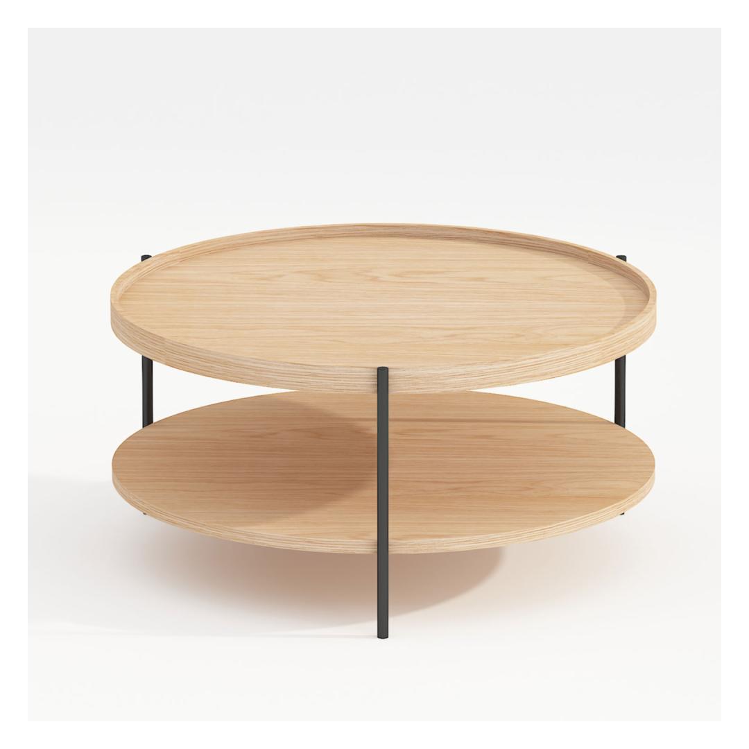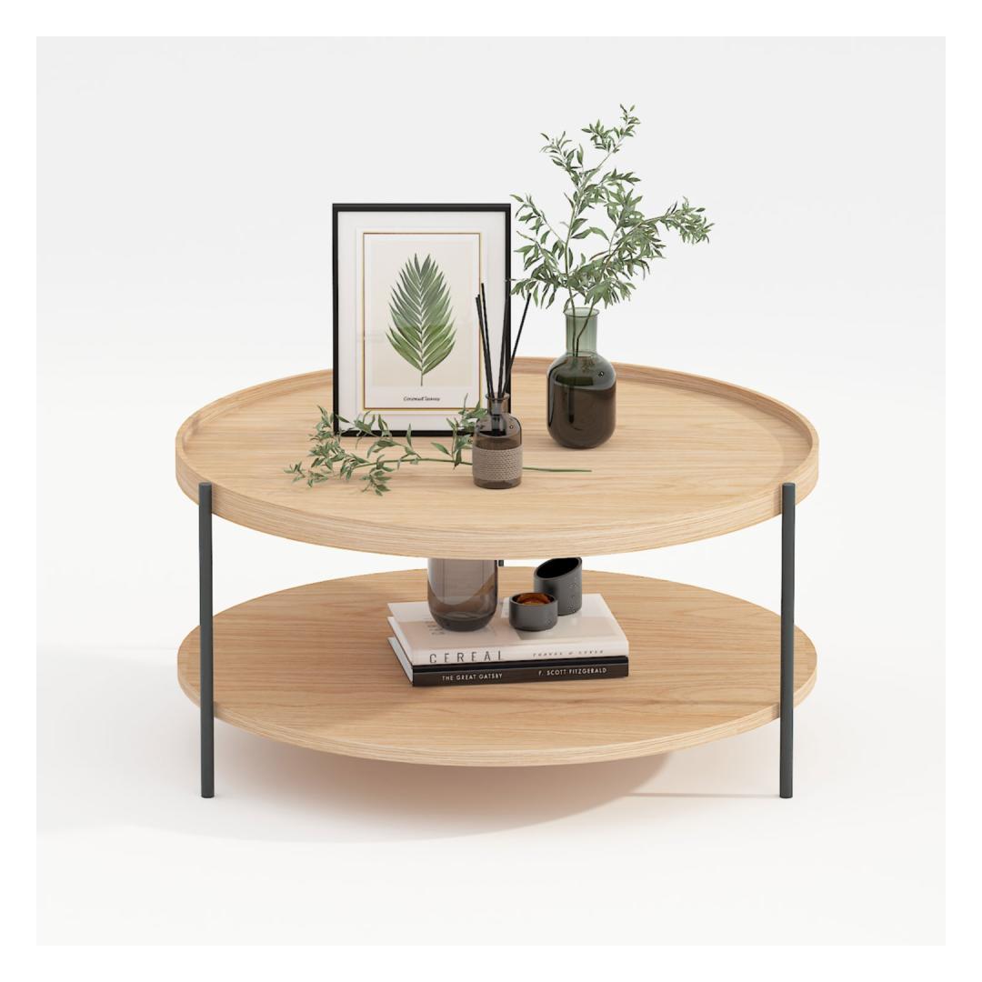 Coffee table CINDY D80xH40cm, melamine oak. The tabletop and lower shelf are made of melamine board with light oak decor. The legs and frame of the table are made of metal and finished with a black powder coating. Diivanilaud CINDY D80xH40cm, melamiin tamm.