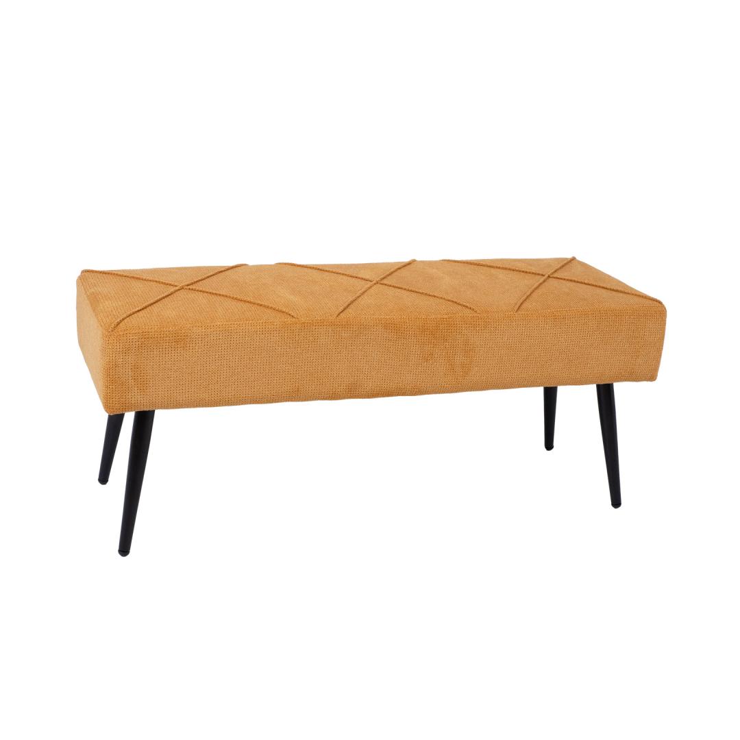 Bench KELSI 100x36x43cm, dark yellow. The bench seat is padded and covered with polyester fabric. The legs of the bench are made of metal and finished with a black powder coating. Pink KELSI 100x36x43cm, tumekollane. Pingi iste on polsterdatud ja kaetud polüesterkanaga. Pingi jalad on valmsitatud metallist ja viimistletud musta pulbervärviga.
