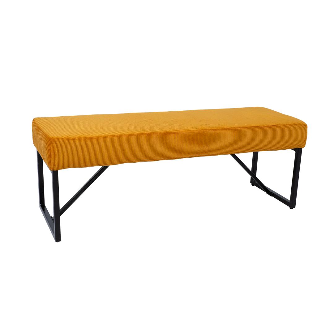 Bench MYLA 110x36x42cm, yellow corduroy. The bench seat is padded and covered with polyester fabric. The legs and base frame of the bench are made of metal and finished with a black powder coating. Pink MYLA 110x36x42cm, kollane velvet. Pingi iste on polsterdatud ja kaetud polüesterkanaga. Pingi jalad ja alusraam on valmsitatud metallist ja viimistletud musta pulbervärviga.