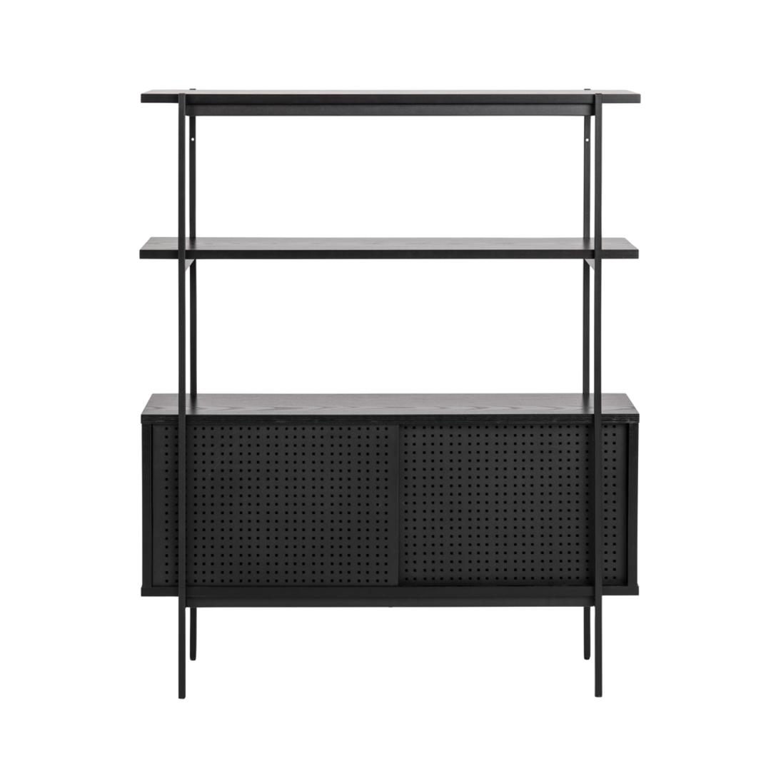 Angus wall unit, frame/shelves: melamine ash black, 1 shelf, cabinet sliding door: mesh, base: metal powder coated rough, matt black. L:94 W:27 H:113.8 cm.