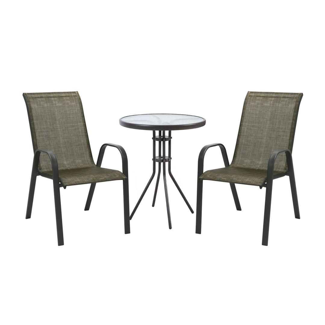 Garden furniture set DUBLIN table and 2 chairs, golden brown. The dimensions of the table are D60xH70cm. Tabletop: 5mm transparent wave glass. The frames and legs of the table and chairs are made of steel and finished with dark brown powder paint. The textilene seat of the chair is well-ventilated, dries quickly, and is easy to clean. The chairs are stackable, helping to save space when not in use. The dimensions of the chair are 55,5x73xH90cm. Seat width 45cm, seat depth 41cm, seat height 44cm. The backrest height is 57cm, armrest height from the ground is 61cm. Weight limit 100kg. Aiamööblikomplekt DUBLIN laud ja 2 tooli, kuldpruun.