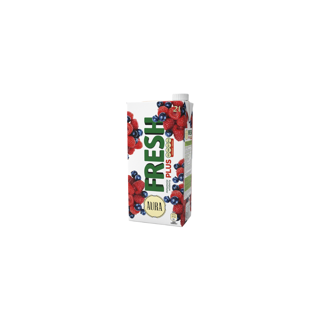Armastatud Aura Fresh mahlajoogist saab nüüd veelgi enam vitamiine! Uus Fresh Plus nime all ilmunud metsamarjamaitseline koguperejook sisaldab kõigile kasulikke B5, B6, B7 ja B12 vitamiine, mis annavad rõõmsa tuju ja aitavad kaasa organismi heaolule. Suviste metsamarjade maitse pole ülemäära tugev ja sobib seega hästi toidu kõrvale ning ka lihtsalt palaval päeval janukustutuseks. Proovi ka samas sarjas ilmunud heleda viinamarja maitset või klassikalist apelsini. Uued Fresh Plus mahlajoogid ei sisalda säilitusaineid ning on saadaval harjumuspärases 2-liitrises korgiga perepakis. Mahlasisaldus vähemalt 6%.