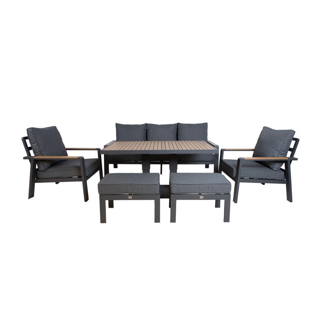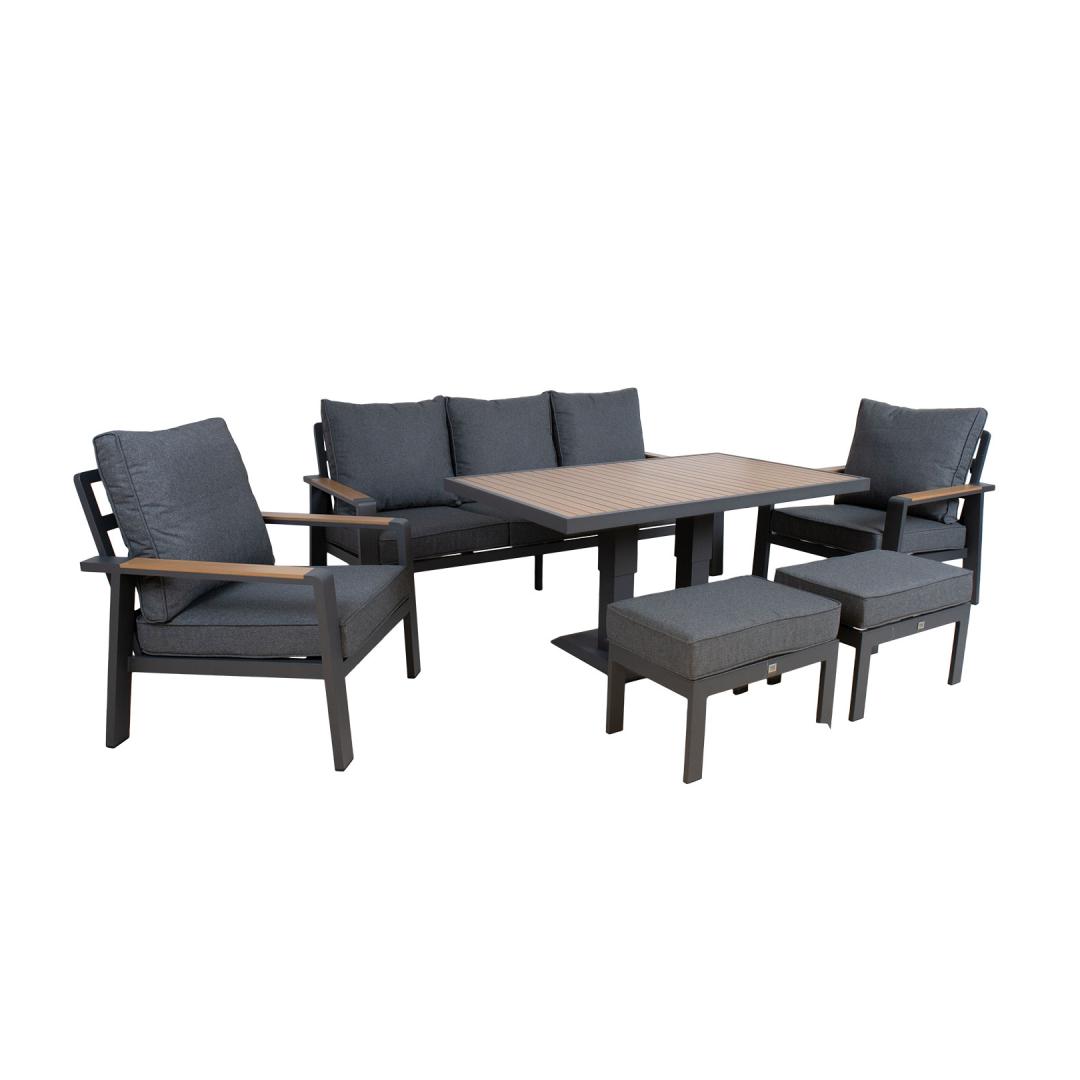 Garden furniture set PARKER 6-parts. The set includes a table with adjustable height, a 3-seater sofa, 2 armchairs, and 2 ottomans. The frames of all parts of the set are made of aluminum and finished with a gray powder coating. The surface finish of the tabletop and chair armrests, reminiscent of the texture of the natural wood grain, has been achieved using the heat transfer printing method. To transfer the texture of wood onto the aluminum surface, a transfer film is placed on the aluminum profile and then subjected to high heat. During the process, ink is transferred from the transfer film to the aluminum surface, creating a wood-like effect. The surface finished in this way is very durable and withstands both sunlight and light scratches. Chair cushions are included. The cushion covers are made of grey polyester fabric. The dimensions of the table are 150x90xH51,5/74.5cm. The dimensions of the 3-seater sofa are 211x95xH87,5cm. The dimensions of the armchair are 81x95xH87,5cm. The dimensions of the ottoman are 65x40xH33cm. Chair weight limit 120kg. The product is durable in changing weather conditions and very easy to maintain. Only cushions need protection from the weather. To prolong the life of outdoor furniture, we recommend using outdoor furniture covers. STORAGE: at the end of the summer season, we recommend storing the garden furniture indoors. Clean and dry the furniture before storing it. Use a dry and well-ventilated room for storage. Aiamööblikomplekt PARKER 6-osaline.