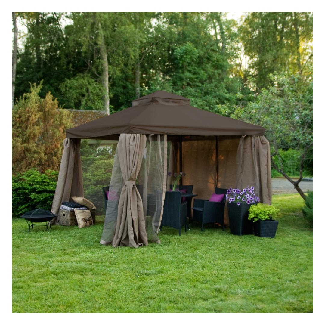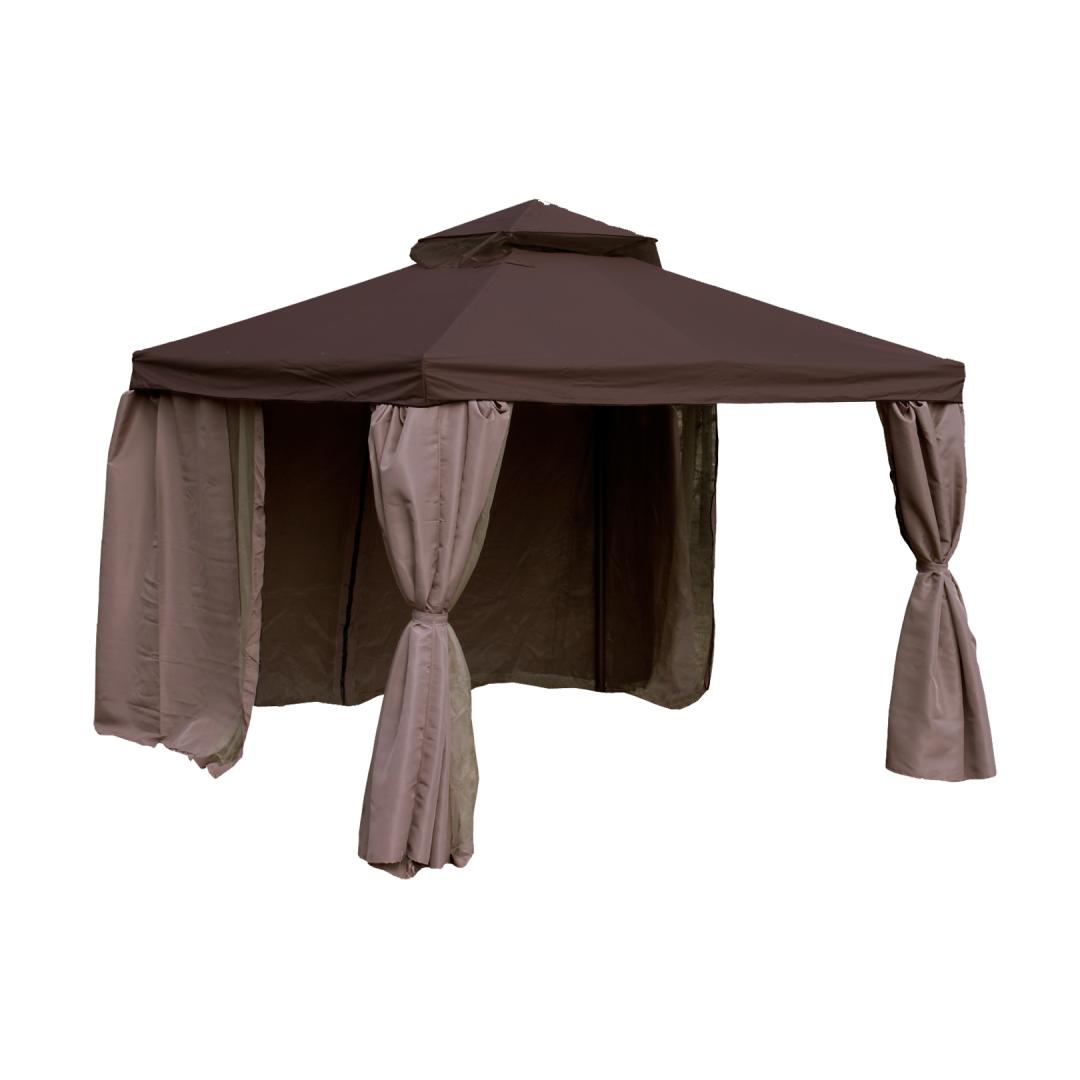 Canopy LEGEND 2.91x3.91xH2/2.8m, brown. The canopy offers pleasant shade from both hot sun and cool wind and allows you to enjoy being outdoors regardless of the weather and time of day. The strong and stable main structure of the canopy is made of aluminum. The details of the roof support frame are made of steel. All frame details are finished with dark brown powder paint. Side post D60mm, roof beams 16x26mm. The roof is made of PVC coated polyester fabric 250g/m², the side walls are made of polyester fabric 150g/m². Mosquito nets are included with the canopy. Anchor the canopy to the base. WARNING: Designed as a temporary installation, the lightweight canopy is not intended for use in high winds and rain and should not be left unattended to adverse weather conditions. The roof and walls are made of materials with very good weather resistance, but they are not waterproof. STORAGE: to extend the life of the product, we recommend disassembling it for the winter season and storing it in a dry and well-ventilated room. Clean and dry the roof and side walls before storage.