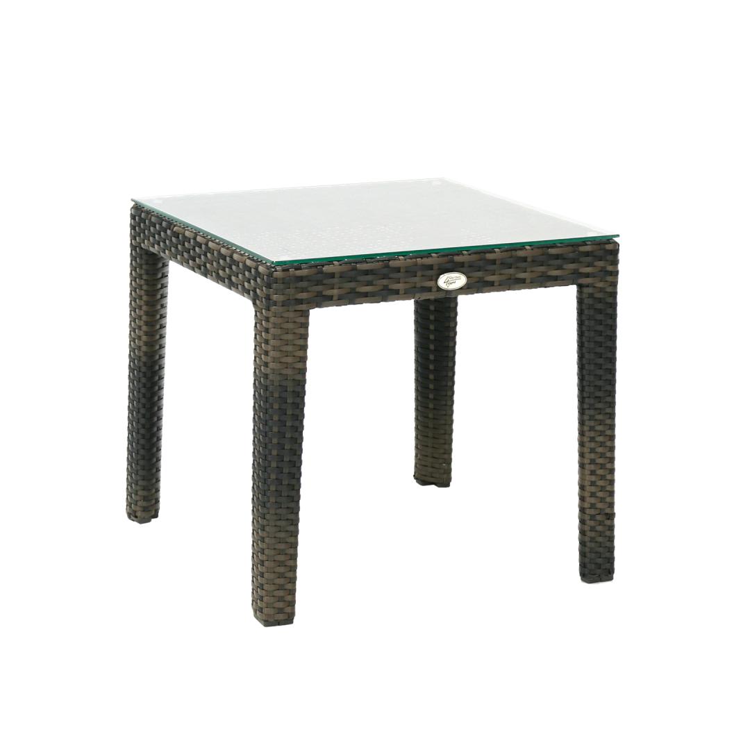 Side table WICKER 50x50xH45cm, dark brown. Side table WICKER frame and legs are made of aluminum and covered with plastic braid. Tabletop: 5mm tempered transparent glass. The product is durable in changing weather conditions and very easy to maintain. STORAGE: At the end of the summer season, we recommend storing the garden furniture indoors. Clean and dry the furniture before storing. Use a dry and well-ventilated room for storage.