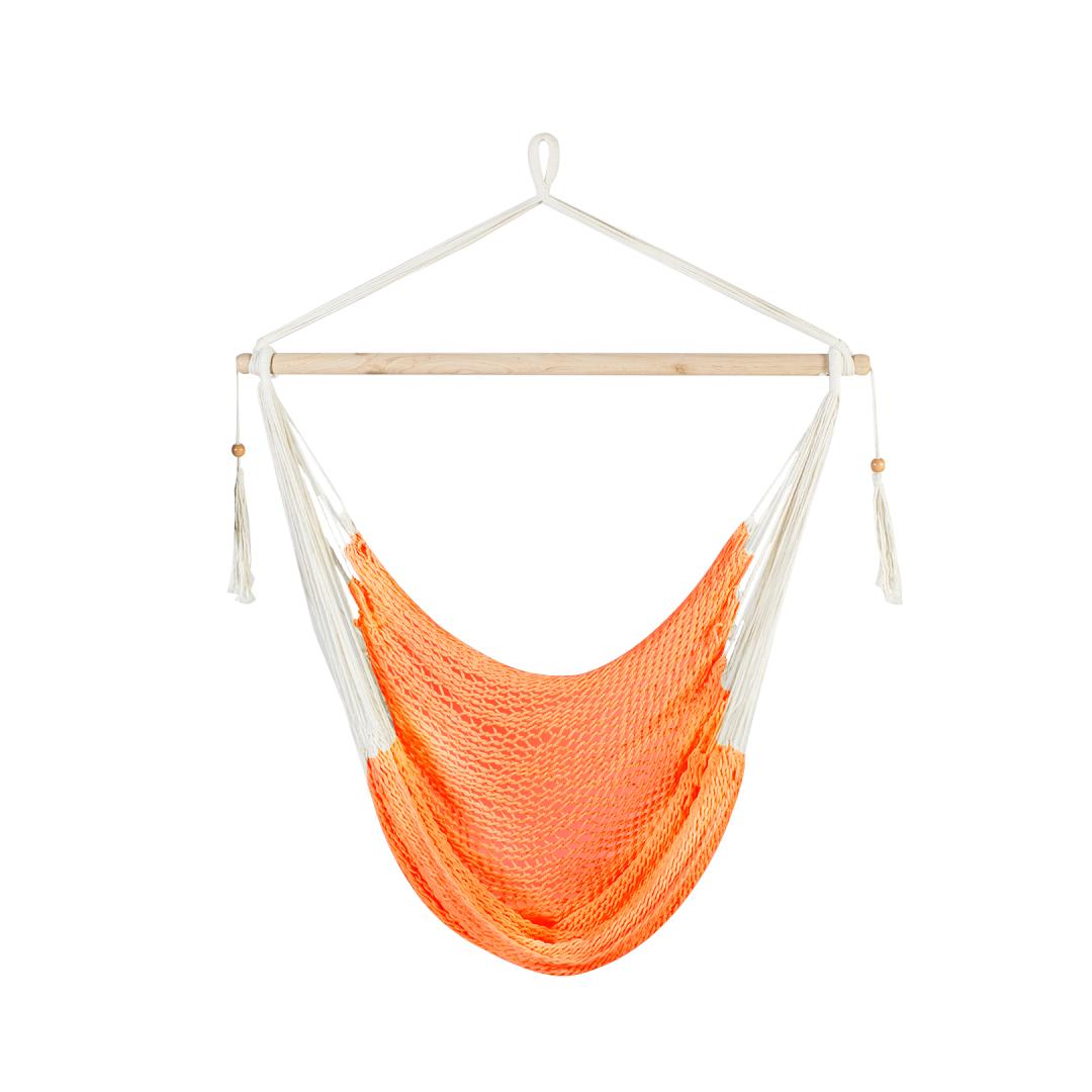 Hanging chair CARINA, orange. The seat of the hanging chair is made of cotton rope. The length of the wooden hanging stick is 100x3.2cm. The maximum load capacity is 100 kg. The hanging chair can be hung from a strong tree branch or beam. It is also possible to use a support leg to hang the swing. MAINTENANCE: To extend the life of the product, protect it from the elements. Do not leave the swing in the sun or rain for a long time. The durability of the fabric and cords decreases under the influence of UV radiation and excess moisture, and the colors fade. If possible, collect the hanging chair after use and store it in a dry, well-ventilated room. Allow the swing to dry completely before storing. The hanging chair can be washed by hand in water up to 40 degrees. Use only mild, non-bleaching detergents.