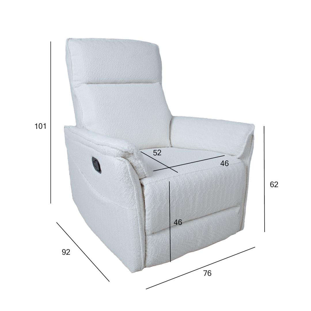 Armchair GERRY manual recliner 76x92xH101cm, white. It is possible to change the position of the footrest of the recliner type armchair using a manual mechanism. To raise the footrest, pull up on the lever on the right outside of the chair. When you push the footrest down, it automatically locks into the initial position. Cover material: 100% polyester fabric, Martindale 15,000. Frame and suspension: plywood, metal. Pocket springs. Upholstery: polyurethane foam, polyester fibers. The overall dimensions of the chair are 76x92xH101cm. Seat width 46cm, seat depth 52cm, seat height 46cm. Backrest height 65cm. The height of the armrest from the ground is 62 cm.