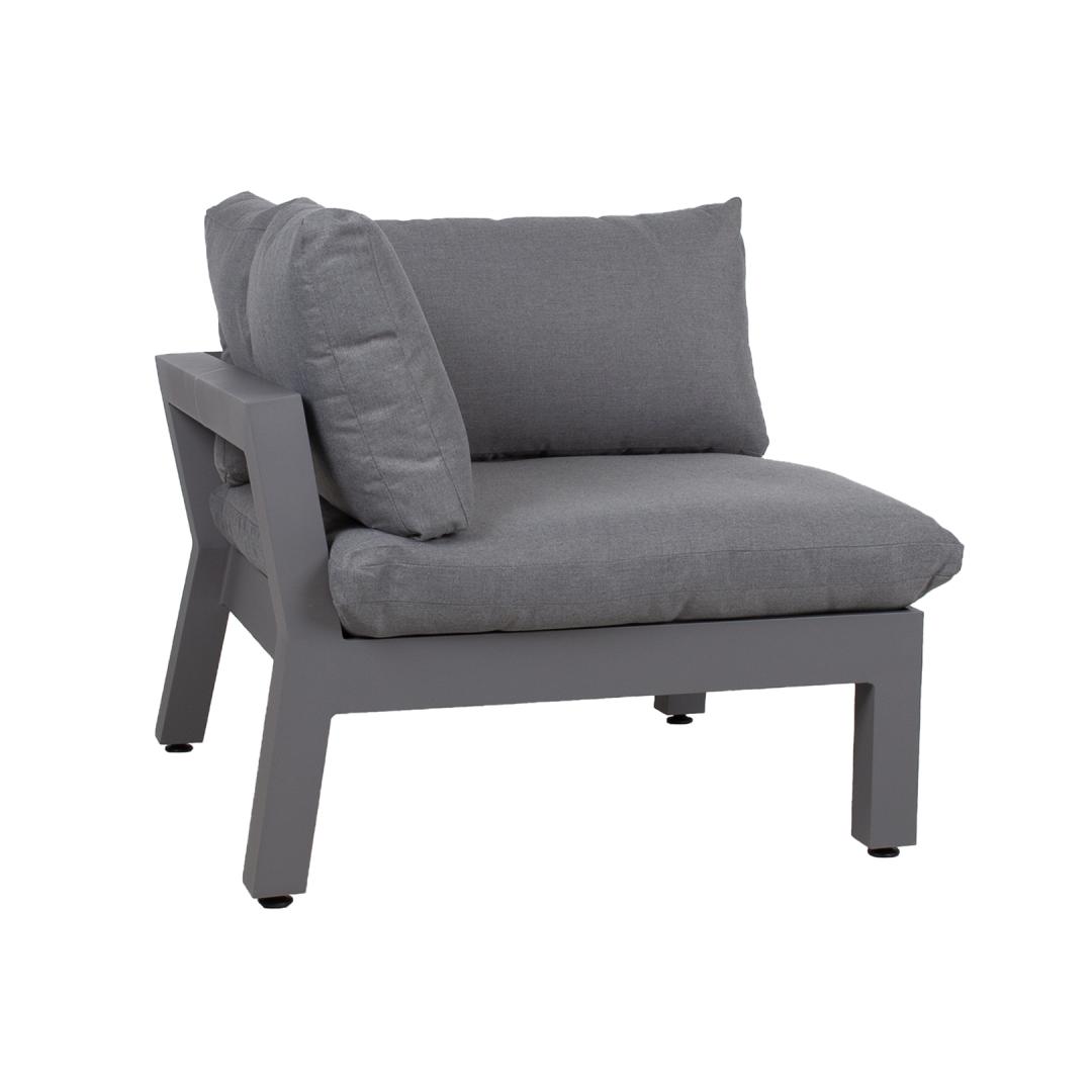 Corner sofa module FLUFFY 93x93xH66cm, gray. A modular sofa is a great way to create a seating area of the right shape and size, which is easy to change and rearrange. The frame of the chair is made of aluminum and finished with gray powder paint. The base of the seat has wide braided straps covered by a 3cm foam mat. Thick and soft cushions and an elastic seat base ensure excellent sitting comfort. The height of the seat to the edge of the frame is 35 cm, including the pillow 51 cm. The dimensions of the seat cushion are 87x87xH16cm, the dimensions of the back cushions are 87x43x18cm, 72x43x16cm. The cushion covers are made of gray polyester fabric. The pillow covers are removable and washable. The product is very durable in changing weather conditions and easy to maintain. Only cushions need protection from the weather. A good solution for daily storage of pillows and keeping them dry is a pillow case. To extend the life of outdoor furniture, we recommend using outdoor furniture covers. STORAGE: At the end of the summer season, we recommend storing the garden furniture indoors. Clean and dry the furniture before storing. Use a dry and well-ventilated room for storage.