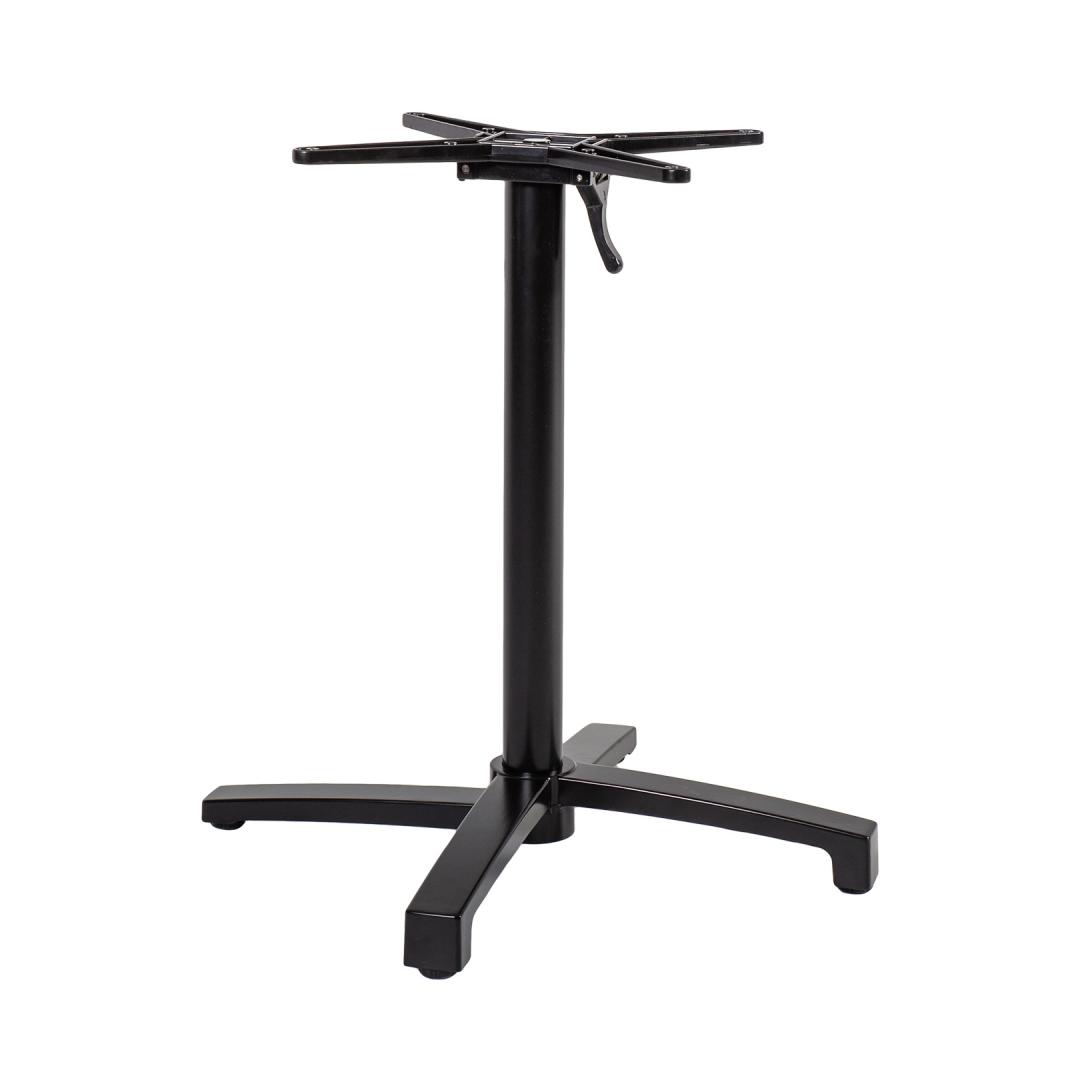 Table leg BISTRO 69x69xH72cm, black. The table leg is made of aluminum and finished with black powder paint. The dimensions of the tabletop carrier are 52x52cm. The carrier can be turned to the side. The dimensions of the base cross are 69x69cm, the support post D60x1.5mm. The maximum dimensions of a tabletop suitable for a table leg are 90x90cm. Table top fixing screws are not included. The product is weatherproof.