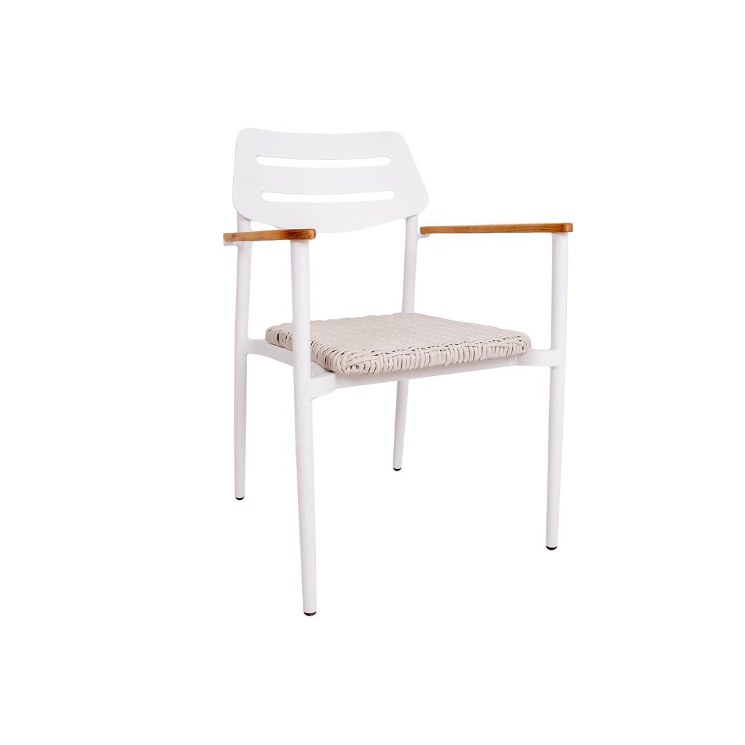 Chair WALES white. By placing garden chairs on the balcony, terrace or garden, you can create a cozy seating area where you can enjoy the beautiful weather during the day or spend cozy evenings. By choosing a suitаble tаble, you can create a harmonious set that you like. The seat of the chair is covered with beige plastic braid. The armrests are made of natural teak wood slats. The frame and backrest of the chair are made of white aluminum. The dimensions of the metal tube are D28x1.2mm. The chair is stackable, which makes it easier to store. The dimensions of the chair are 56x60xH82cm.