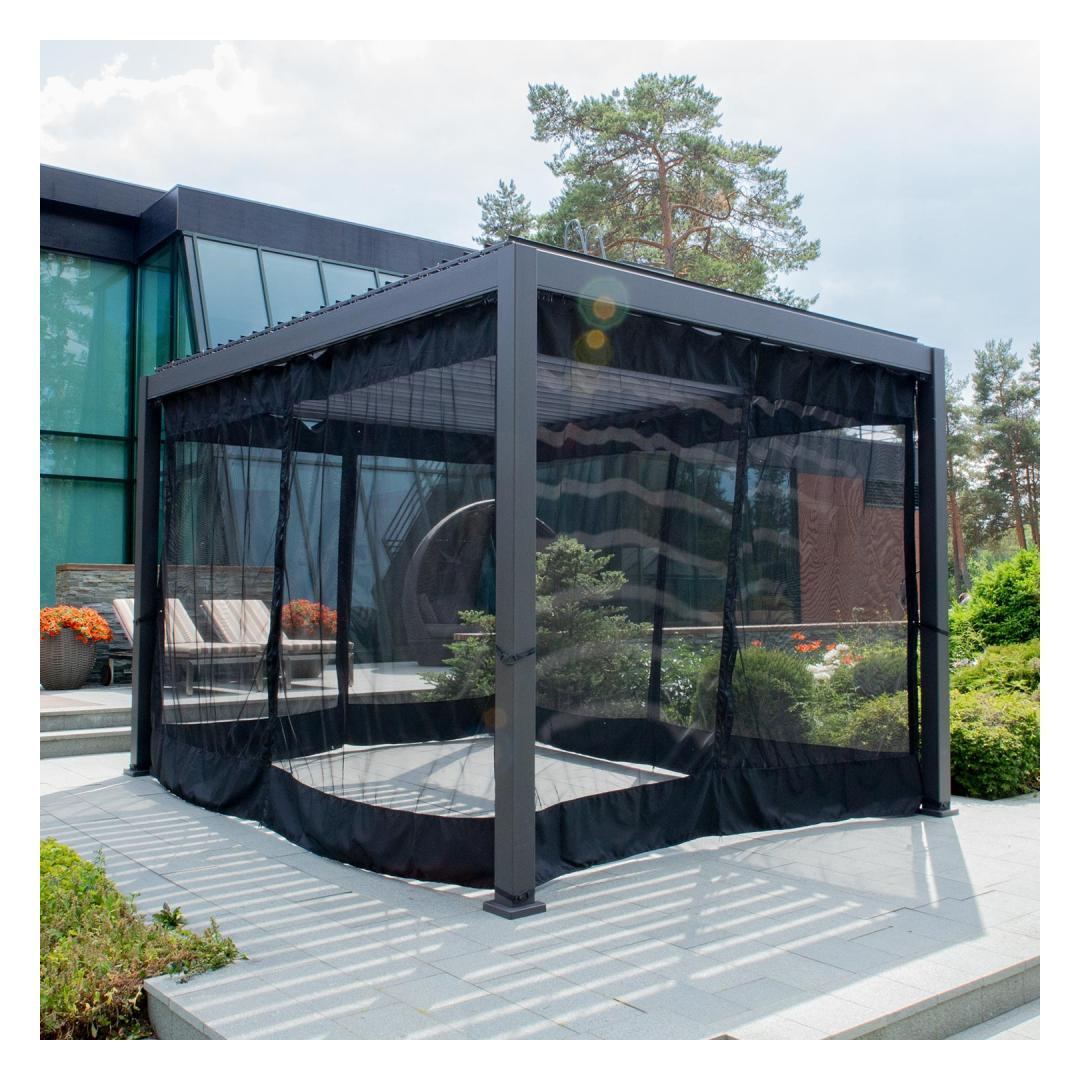Mosquito nets for canopy MIRADOR 3x4m. The curtains are made of black polyester mesh 70g/m². The curtains can be closed with a zipper. The set includes curtains for 4 sides of the canopy. Curtain rails and hooks for hanging curtains are not included. In addition to mosquito nets, side curtains made of polyester or textilene and blind or slatted walls can be purchased as additional equipment for the MIRADOR canopy. With the help of different types of walls or curtains, it is easy to change the functionality of the canopy and give it a pleasing look and ease of use. STORAGE: At the end of the summer season, we recommend removing the mosquito nets from the canopy. Clean and dry mosquito nets before storing. Use a dry and well-ventilated room for storage.