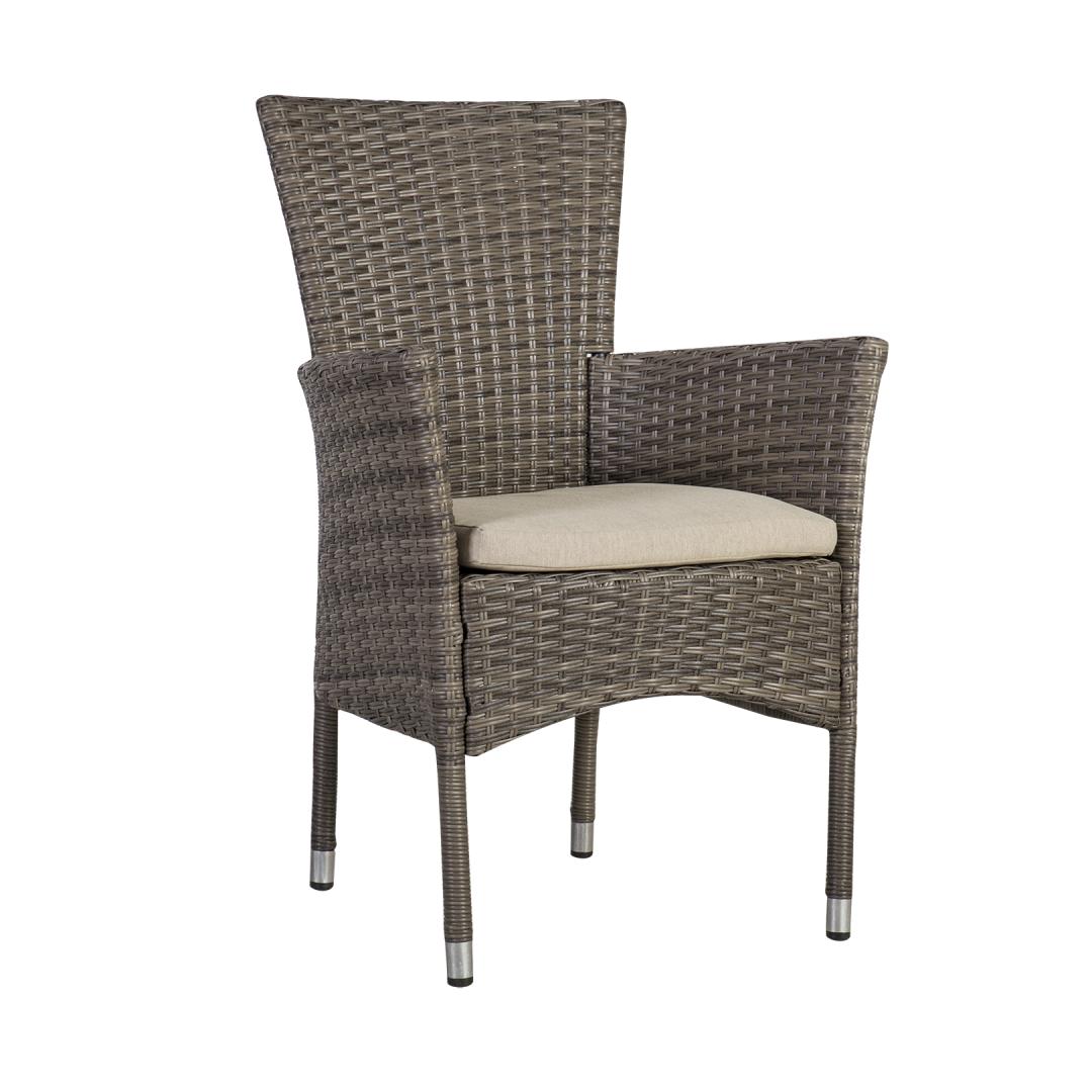 Chair PALOMA 57x59xH90cm, grey-brown. The powder-coated steel frame of the chair is covered with plastic braid. The seat cushion is included. The pillow cover is made of beige polyester fabric. Pillow measures 44x46x5cm. The dimensions of the steel tubes of the frame and legs are D25x0.8mm. Chair seat width 45cm, seat depth 46cm, seat height 47cm (with cushion). Backrest height 50cm, armrest height from the ground 63cm. Weight limit 100 kg. The product is highly resistant to changing weather conditions and does not require special maintenance. Only the pillow needs protection from the weather. STORAGE: At the end of the summer season, we recommend storing the garden furniture indoors. Clean and dry the furniture before storing. Use a dry and well-ventilated room for storage.
