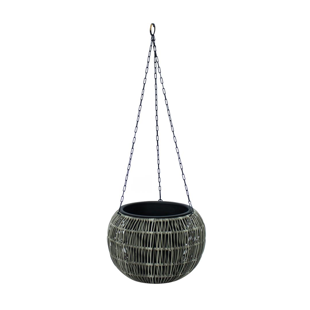 Hanging planter WICKER D32xH22cm, grey. The metal frame of the planter is covered with plastic wicker. The dimensions of the plastic inner pot are D21xH20cm. The inner pot is without a hole. Black metal hanging chains 57cm. Lilleampel WICKER D32xH22cm, hall. Lillepoti metallraam on kaetud plastikpunutisega. Plastikust sisepoti mõõdud on D21xH20cm. Sisepott on ilma auguta. Mustad metallist riputusketid 57cm.
