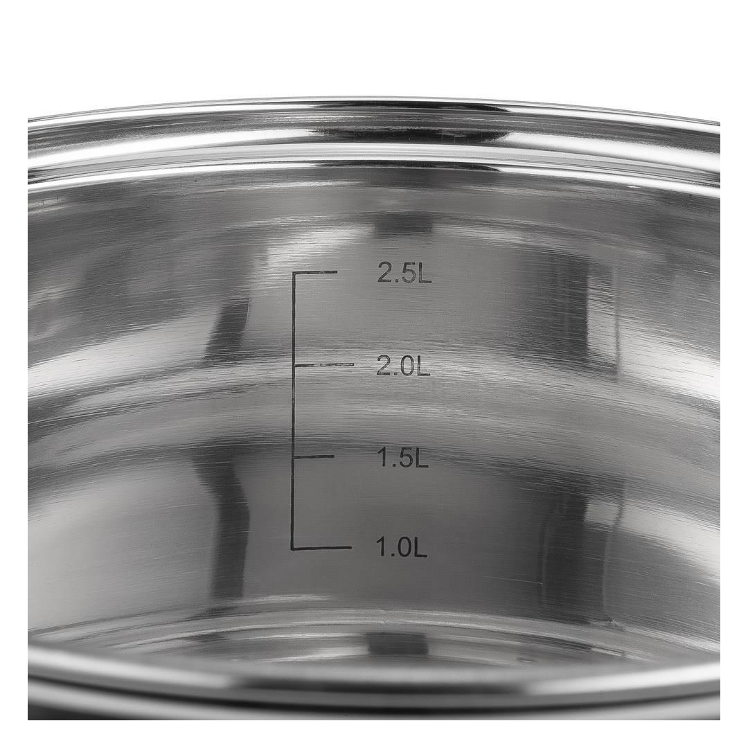 Casserole with lid D20, h=11cm, 3.6L. Glass lid with steam outlet Measuring scale Riveted stainless steel handles Induction (suitable for all types of stoves) Bottom thickness: 1mm Table height: 11.0cm Material: stainless steel Handle material: stainless steel Inner coating: stainless steel Lid material: tempered glass coated steel Lid material: : mirror polishing Outer coating color: 30% mirror / 70% satin Flame protection color: silver Certificate: LFGB (Tuv lab) Measuring scale Casserole with lid D20, h=11cm, 3.6L.