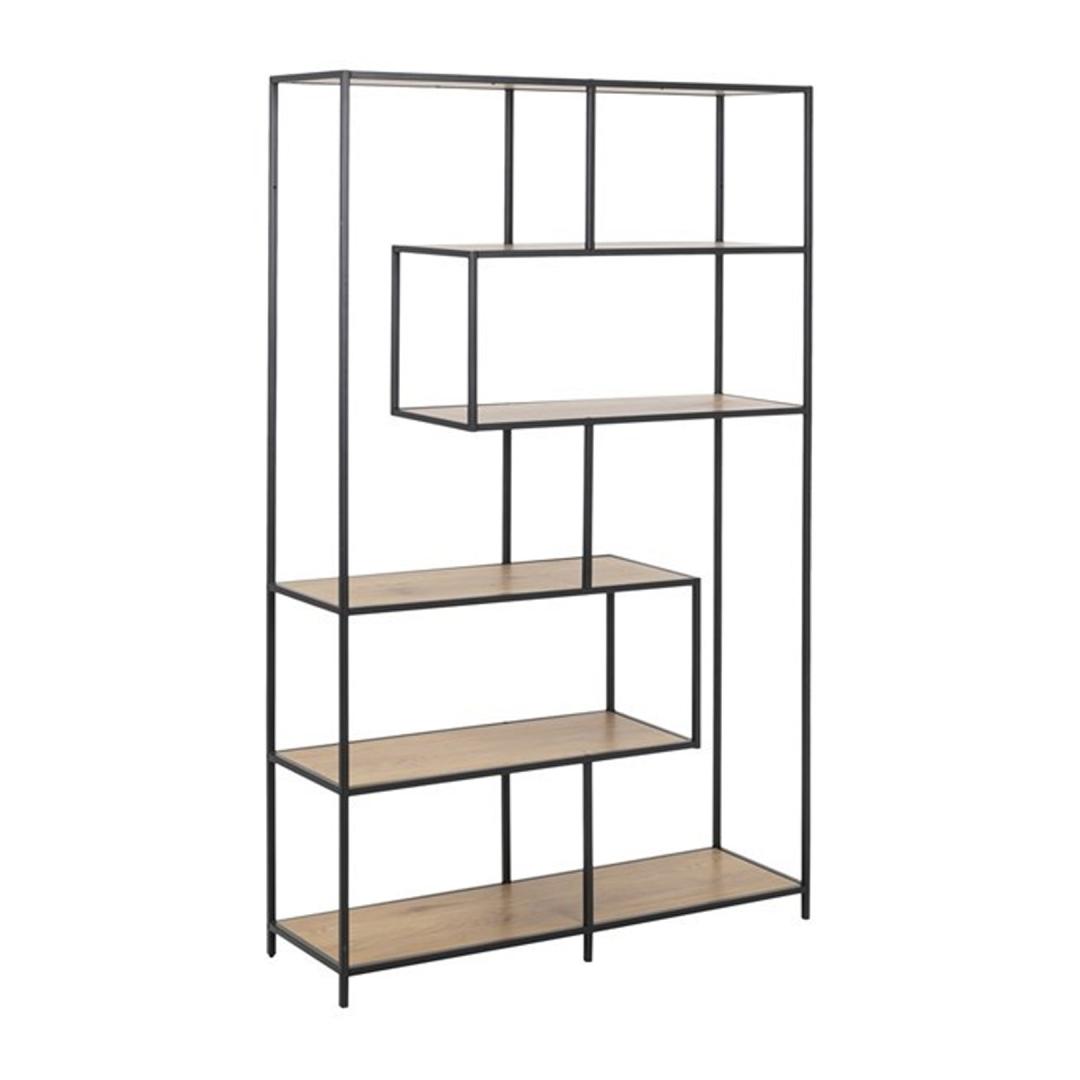 Shelf SEAFORD 114x35xH185cm, oak. A tasteful and practical shelf can be used in different rooms for convenient storage of things. The shelves are made of furniture board with a laminated coating. The color is oak. The frame is made of black metal. The dimensions of the product are 114x35xH185cm.