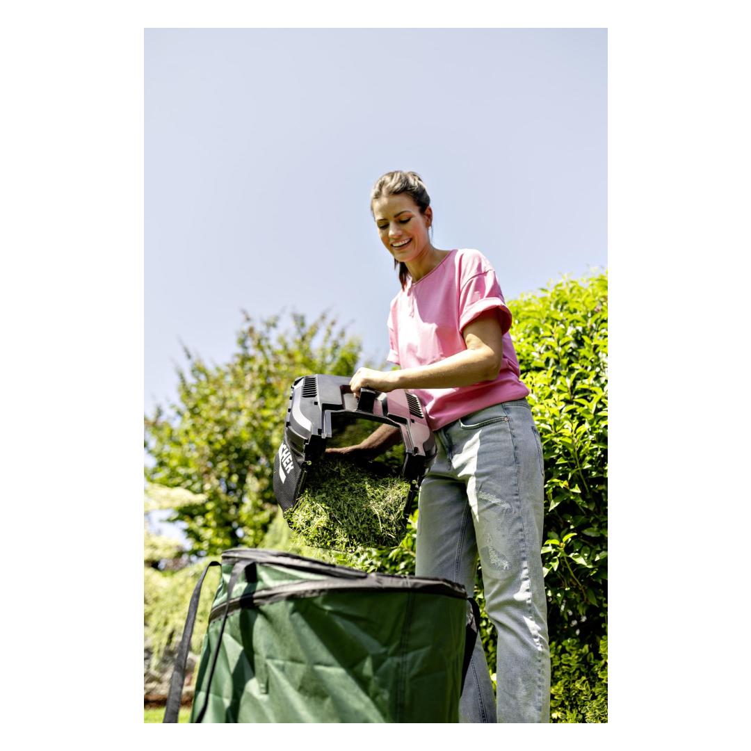 The 18-volt battery lawn mower is lightweight, manoeuvrable and has a powerful brushless motor. Lawns of up to 350 square metres are mowed quickly and with precision. The working width is 34 cm and the cutting height can be adjusted to one of five levels, ranging from 25 to 60 mm. The intelligent iPower engine control system automatically adapts the speed to the grass conditions when mowing. Along edges or borders, lawn combs straighten the blades of grass, ensuring no blade is missed. The 2-in-1 mowing system allows the grass clippings to be evenly distributed over the lawn as a natural fertiliser during mulching or collected in the 35-litre grass catcher container – for non-stop mowing for longer. The guide handle is height-adjustable for a comfortable, ergonomic working position. The folding frame saves space when stored. Integrated transport handles are provided for carrying up stairs and over steps with ease. A battery and fast charger are included in the set.