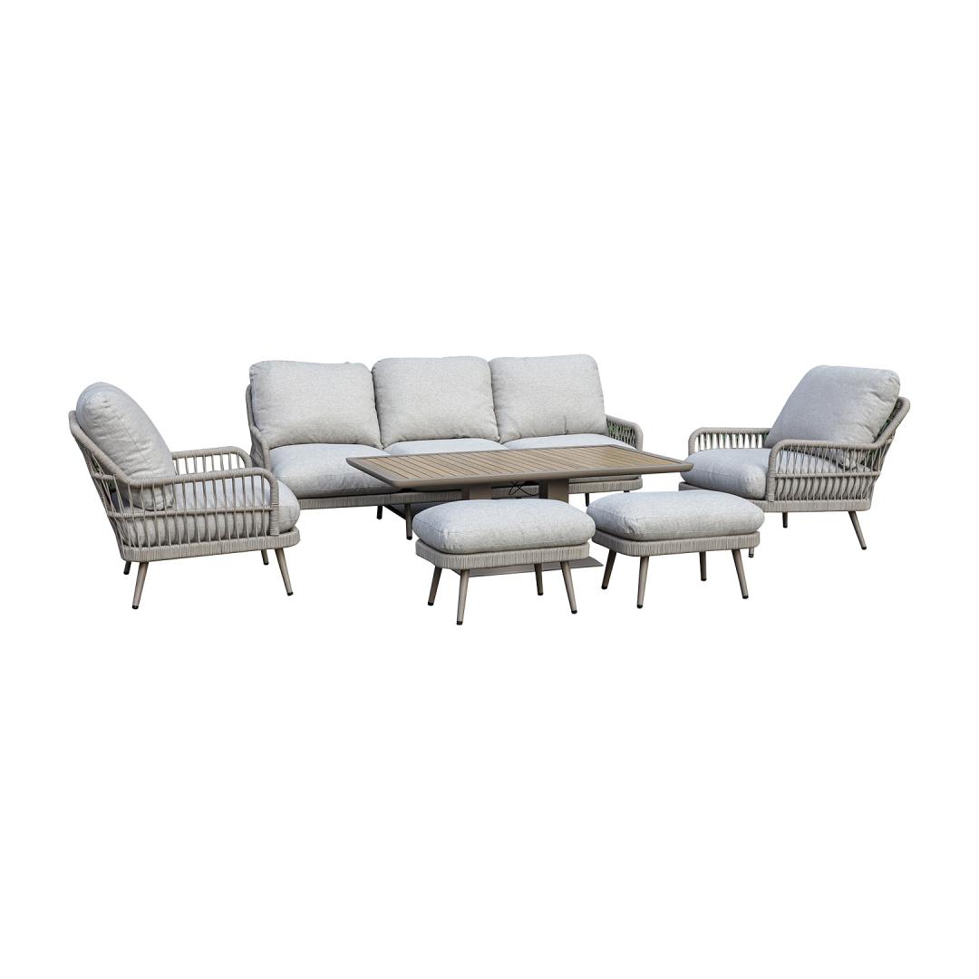 Aiamööblikomplekt MARENDA laud, diivan, 2 tugitooli ja 2 tumbat, hall/beež
