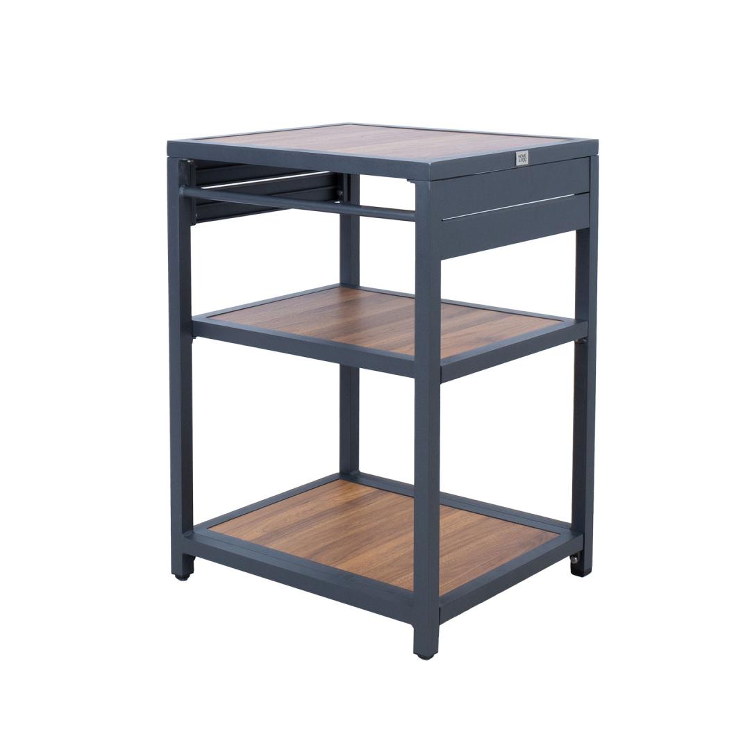 The frame and shelves of the kitchen module are made of aluminum. The frame is finished with dark gray powder paint. The shelves are painted in a brown color reminiscent of natural wood texture. Väliköögi moodul BODEN 51x60xH85cm.