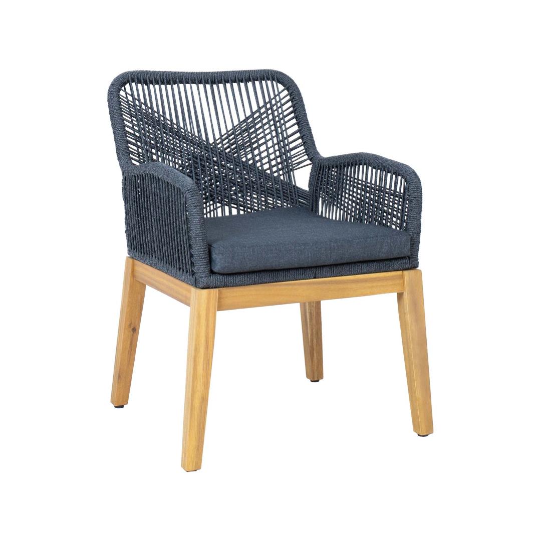 The legs and base frame of the chair are made of acacia wood and finished with teak-colored wood preservative oil. The frame of the seat is made of galvanized steel tube and covered with an elegant rope braid. The seat cushion is covered with polyester fabric.