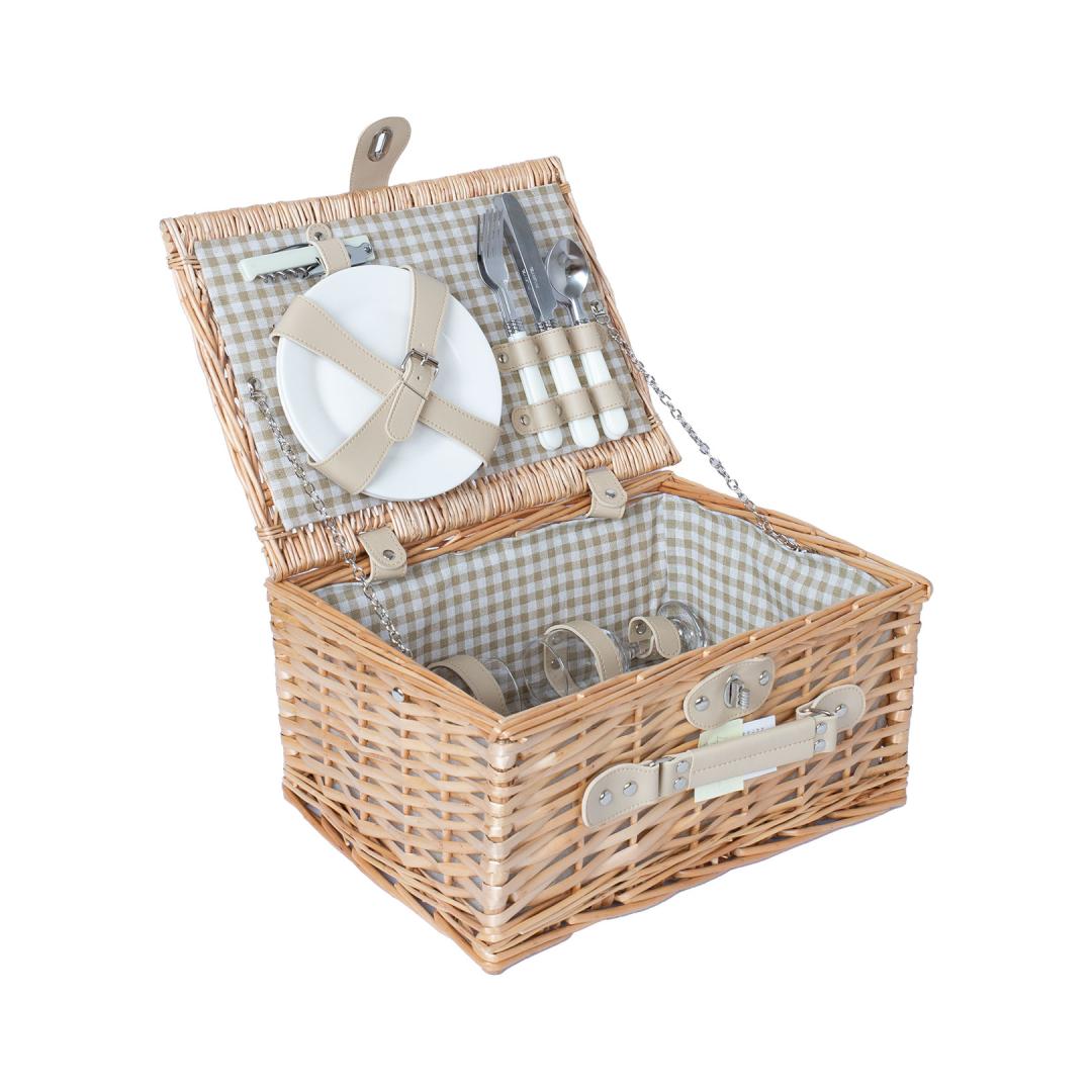 A stylish willow basket with tableware.