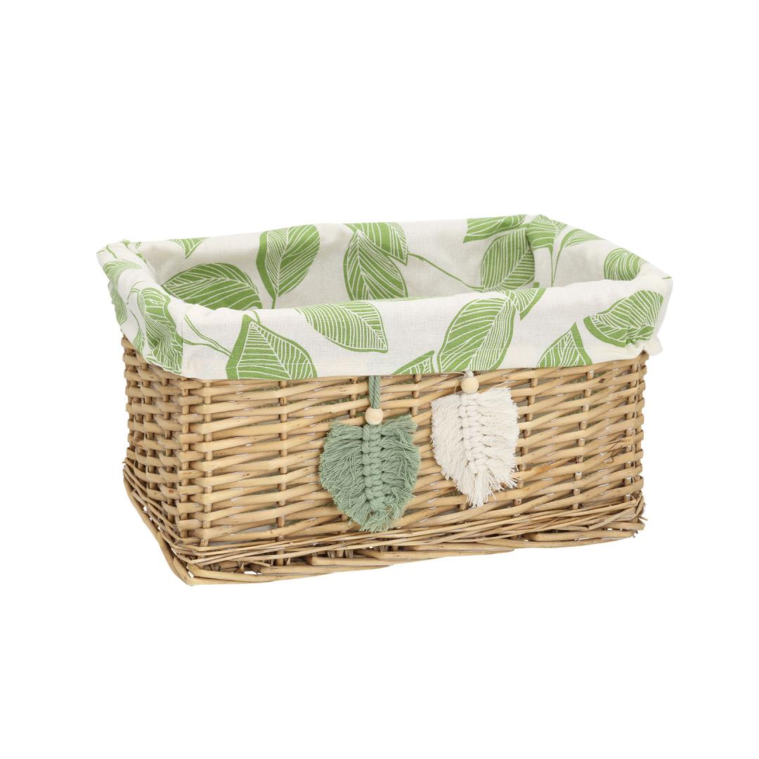 Textile lining: cotton fabric with green leaves pattern. Korvi materjal: käsitsi punutud naturaalne pajuvits.