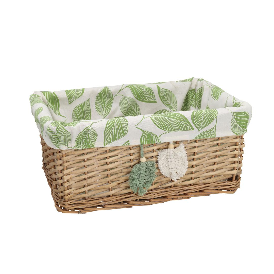 Textile lining: cotton fabric with green leaves pattern. Korvi materjal: käsitsi punutud naturaalne pajuvits.