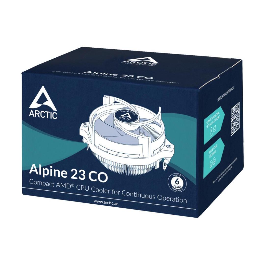 ARCTIC Alpine 23 CO - Compact AMD CPU-Cooler for continuous operation. Type: Air cooler, Fan diameter: 9 cm, Rotational speed (min): 200 RPM, Rotational speed (max): 2700 RPM, Noise level: 0.3 sone, Bearing type: Dual ball bearing. Width: 121 mm, Depth: 98.6 mm, Height: 65 mm. Product colour: Aluminium, Black