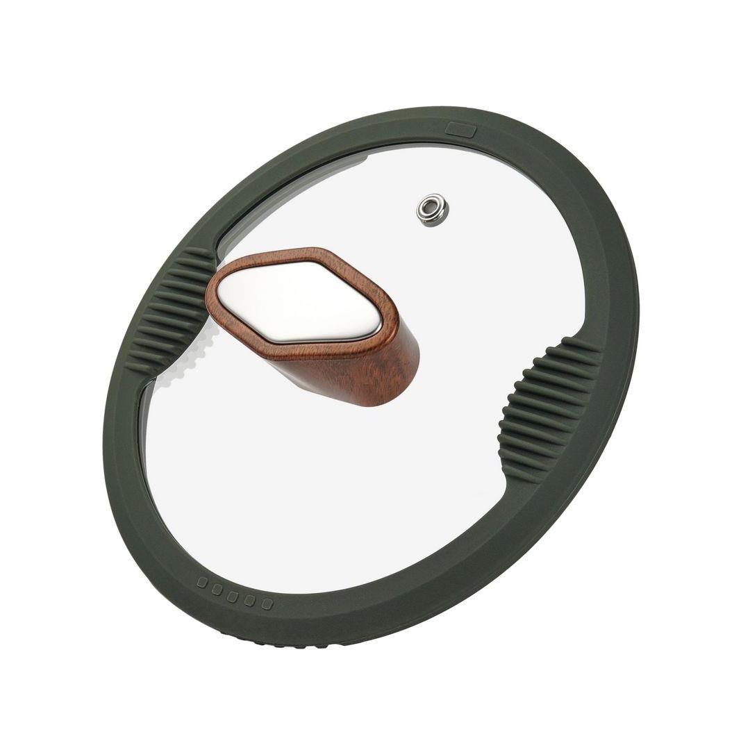 Glass lid with silicone rim and double-sided drain features silicone inserts to protect fingers when draining water
