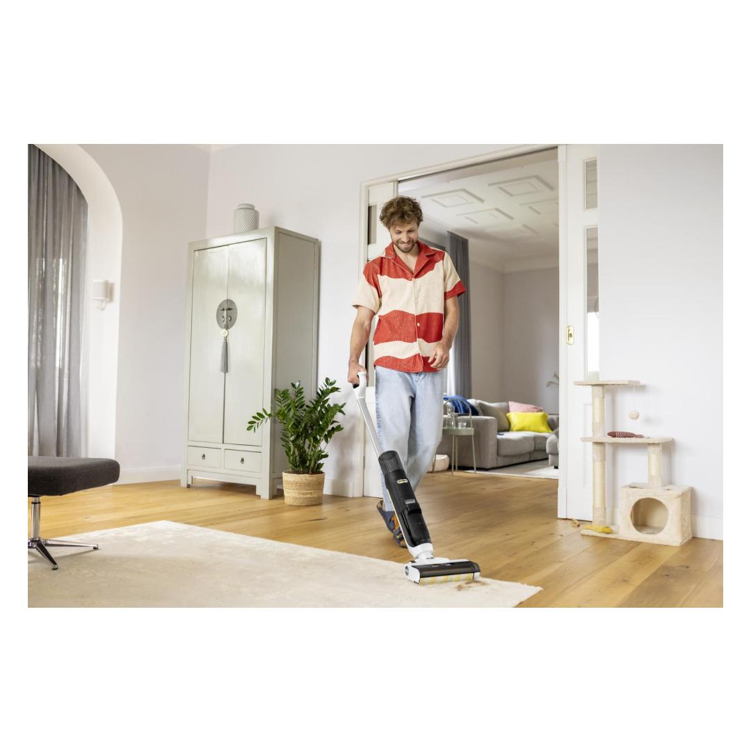 FCV 3 – for floors so clean they shine. The 3-in-1 floor cleaner with the innovative Xtra!Clean function vacuums, mops and dries floors, making cleaning hard floors, carpets and even spills easier and saving up to 50% of cleaning time.* Choose one of three cleaning modes – standard mode with water supply, dry mode or the powerful Advanced!Power mode*** – and get rid of any dirt, whether it's dust, pet hair or stubborn, dried-on stains. The Hygienic!Spin technology with up to 500 drum revolutions per minute not only ensures a perfect floor cleaning result, but also kills up to 99 percent of bacteria**, ensuring hygienic cleanliness. In addition, the long-lasting battery with up to 30 minutes of operating time, which in turn allows you to clean up to 130 square meters without interruption, and the integrated self-cleaning function provide maximum convenience for you - easy cleaning and maintenance of the device without getting your hands dirty.