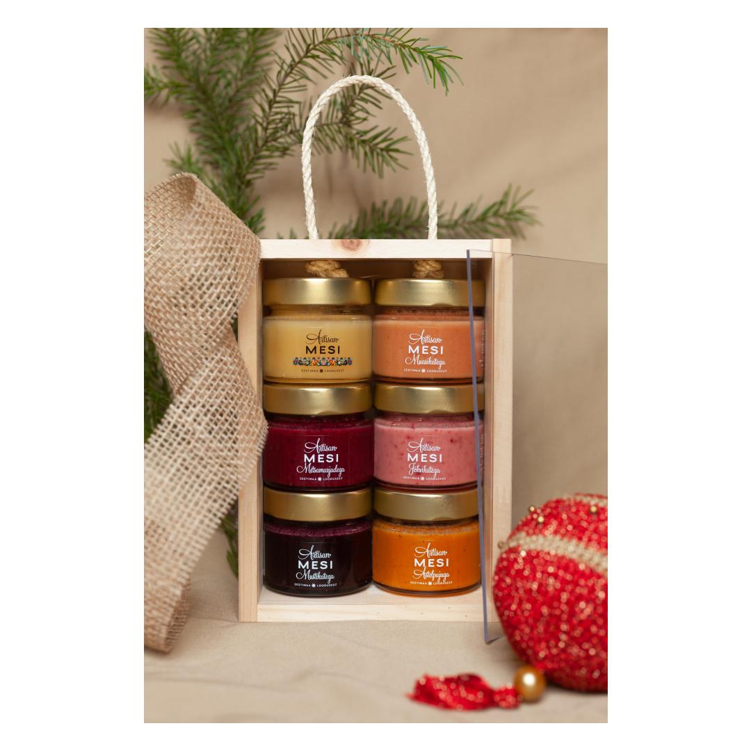 Artisan Honey assortment in a wooden box with a transparent lid and a rope handle. • Blossom honey 100 g • Honey with blueberries 100 g • Honey with cranberries 100 g • Honey with wild berries 100 g • Honey with strawberries 100 g • Honey with sea buckthorn 100 g