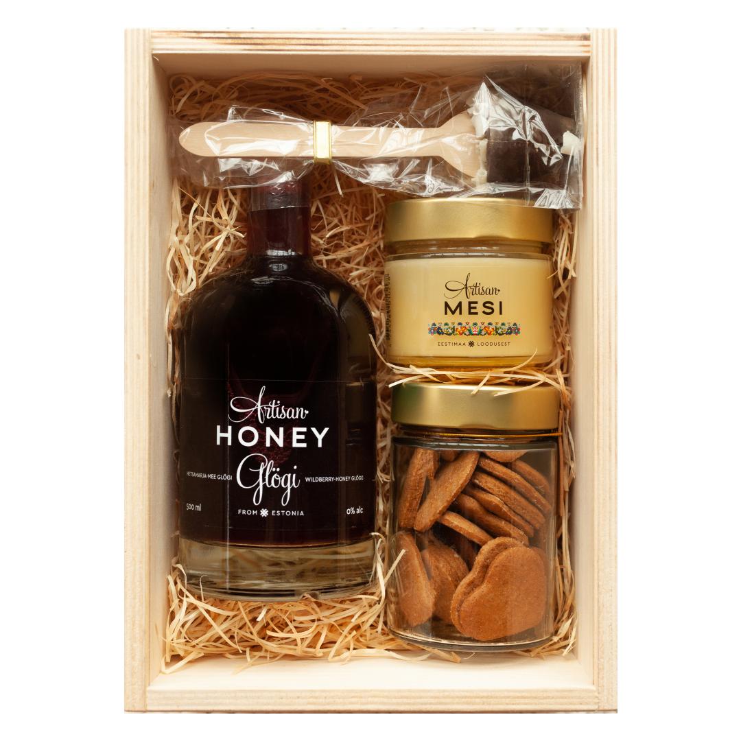 • Wild berry and honey mulled wine 500 ml (non-alcoholic)* • Blossom honey 200 g • Honey gingerbread 120 g • Chocolate spoon 45 g Artisan Honey set in wooden gift box AH20K2.