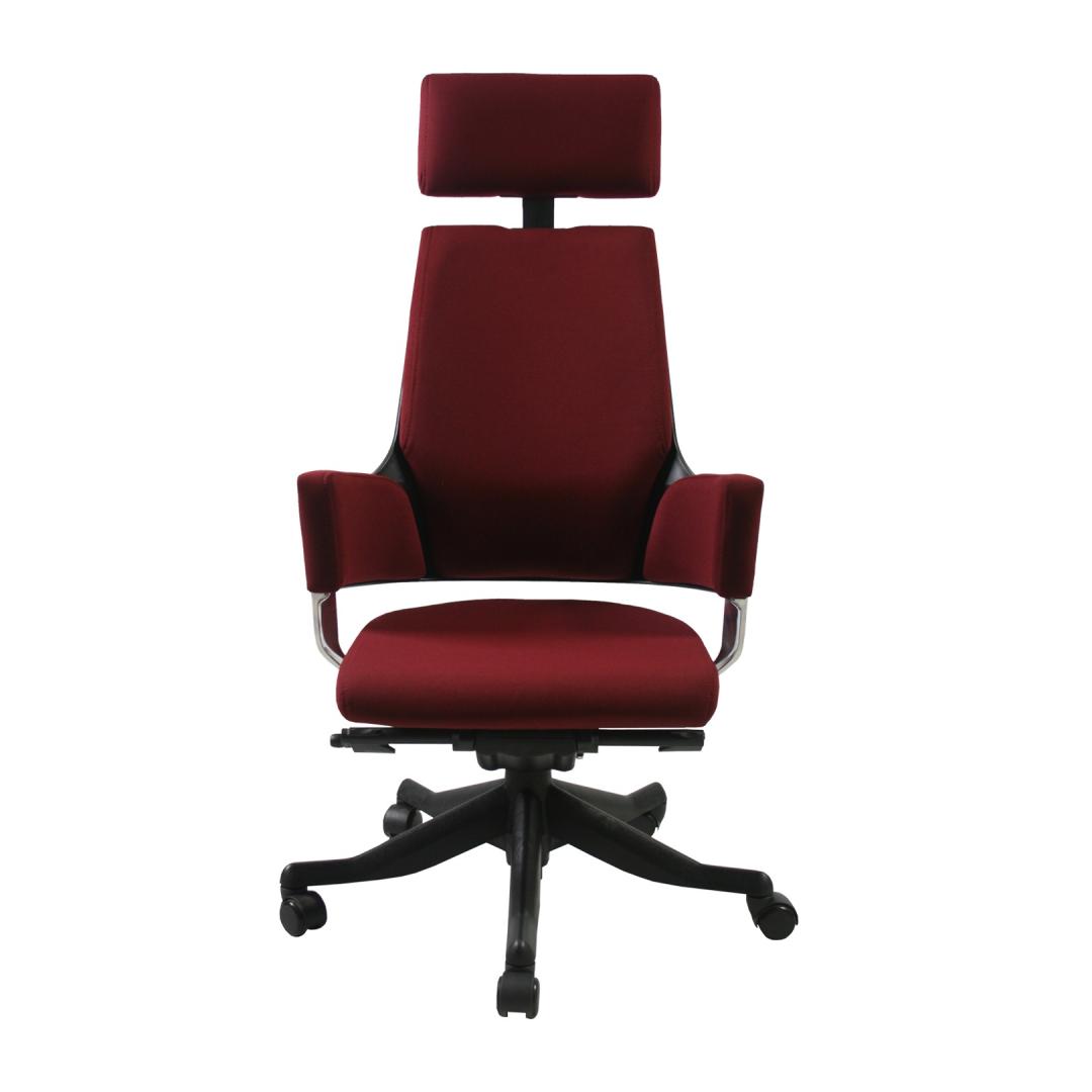 Task chair DELPHI dark red. The DELPHI chair is solid and dignified, without compromising on comfort and ergonomics. The back and armrests of the chair form a compact unit that gives a sense of security and adequate support. The outer shell of the backrest is molded of black plastic (100% PP recyclable) which is complemented by die-cast aluminum parts in a smooth polished finish on the sides of the chair. The seat and back are upholstered and covered with durable polyester fabric, Martindale value 50,000. The chair has a synchronized mechanism with tilt tension control and a stepless recline lock, allowing the locking of the backrest at any chosen position. The seat height is adjustable by the gas shock absorber. The height of the headrest is adjustable. The chair's 5-prong base is made of black plastic. The chair has floor-saving auto-brake nylon castors. The overall dimensions of the chair are 70x70xH117,5-133,5cm. Seat width 47cm, seat depth 47cm, seat height 41,5-53cm. Weight limit 120kg.
