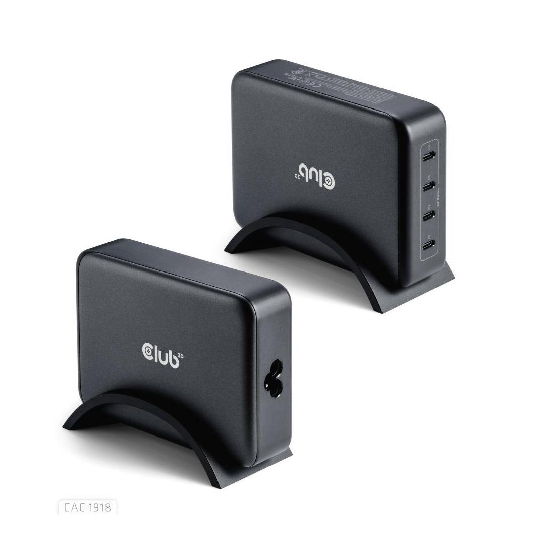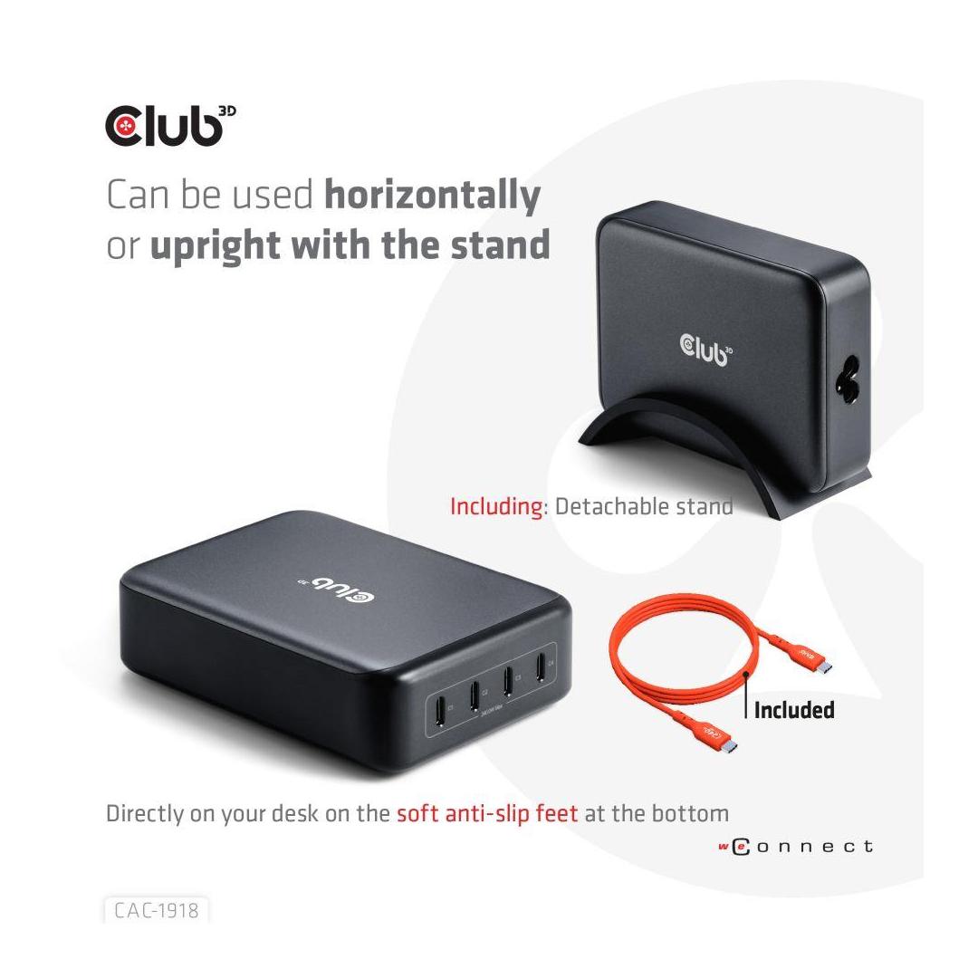 The Club 3D CAC-1918 Travel Charger 240 Watt GaN technology, Four port USB Type-C, Power Delivery(PD) 3.1 and PPS Support is a high-performance and fashionable design travel charger. Versatility: Perfect solution for business travelers and power users needs and multiple ports. This means you only need one charger for all your modern devices, and you don't have to worry about carrying multiple adapters. Portability: Highly portable and easy to carry (535 gr / 18.87 oz) in a backpack or luggage, making it ideal for business travelers who need to stay connected on the go without being weighed down by bulky chargers. Powerful charging: The 240 Watt charger charges multiple devices simultaneously at high speed, while improving the life of your batteries at the same time. Ensuring busy travelers can stay productive on the move without waiting around for hours. Built-in safeguards protect your devices against excessive current, overcharging and overheating(OCP-OTP-SCP-OVP). The unit comes with a suporting bridge to position the unit uprigth.