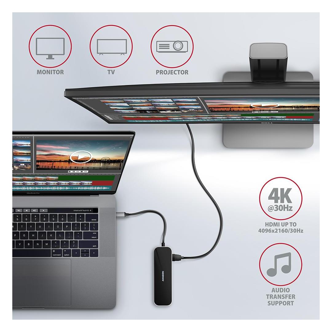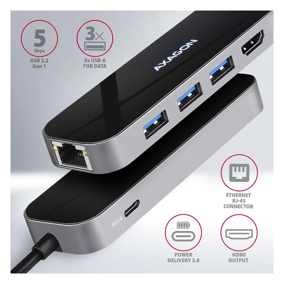 Elegant aluminum body ensures mechanical resi Multiport USB-C 3.2 Gen 1 hub AXAGON HMC-6GL expands your laptop, computer or phone with six ports. You can easily and quickly connect up to three USB devices, Gigabit Ethernet network and HDMI display to your computer at the same time via the doublesided USB-C connector. You also get the possibility to supply laptop using Power Delivery technology at the same time. The USB-C hub will provide you with a simple and compact 6in1 docking station for notebook like MacBook Pro.