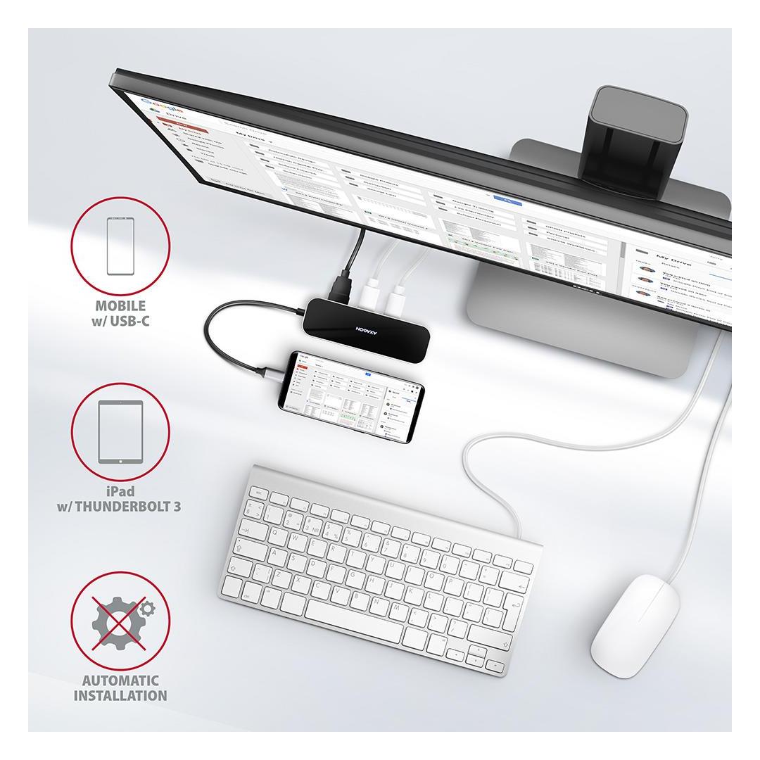 Port replicator is an ideal accessory for laptops without USB-A connectors, network card and video output. You can use your current USB peripherals without having to purchase new ones. Thanks to the Plug and Play and Hot Plug functions, the connection of the hub is very simple without complicated installation. It is also possible to easily connect and disconnect peripherals while the computer is running. The hub does not afraid of connection to phones with a USB-C connector - for example, you can connect a flash drive, keyboard, mouse, display, TV or projector to the phone.