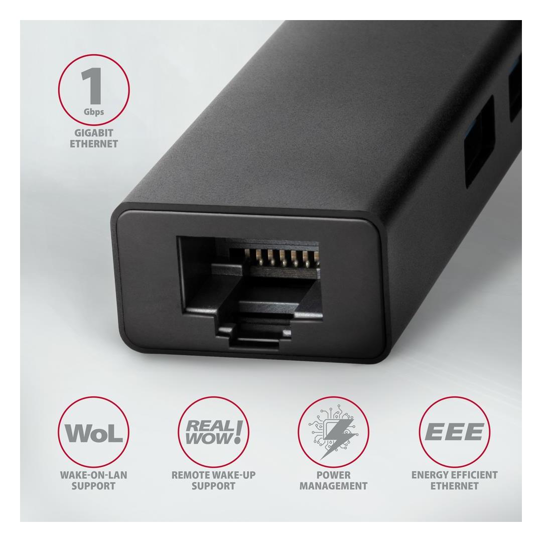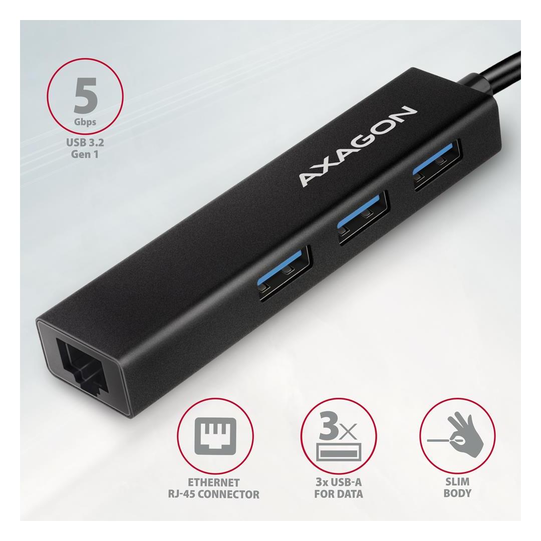• 3x SuperSpeed USB port, USB-A female connectors. Slim metal USB-C 3.2 Gen 1 (USB 3.0) multi-port hub AXAGON HMC-GL3A connects up to three USB devices to laptop or computer and also adds Gigabit network card which connects your computer to high speed network.