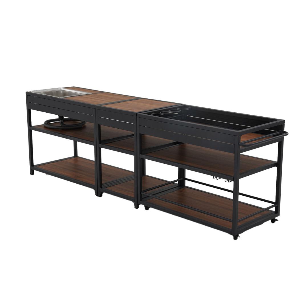 Mitmekülgne ja funktsionaalne väliköök sobib ideaalselt koduaeda, terrassile või toitlustusettevõtete välialal kasutamiseks. Piiretega riiulid, pudelite ja pokaalide hoidikud pakuvad piisavalt ruumi toiduainete, nõude ja köögitarvete turvaliseks paigutamiseks. Tänu kraanikausile on kööginurga kasutamine ja puhtana hoidmine lihtne ja mugav.