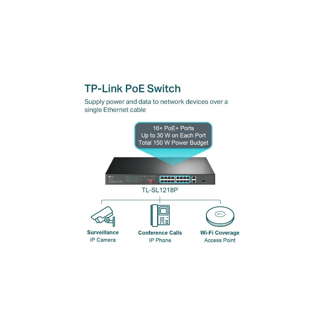 The TL-SL1218P is fully compatible with PoE devices, such as IP cameras, access points, and IP phones. It also works with non-PoE wired devices, such as PCs, printers, and IPTV.