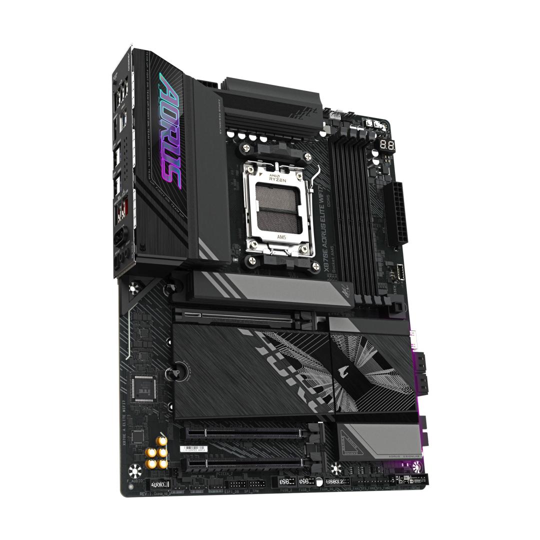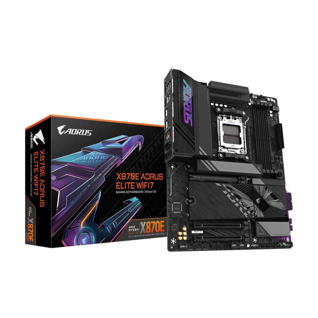 GIGABYTE X870E AORUS ELITE WIFI7 Motherboard - Supports AMD Ryzen 9000 CPUs, 16+2+2 Phases Digital VRM, up to 8000Hz DDR5 (OC), 3xPCIe 5.0 + 1xPCIe 4.0, Wi-Fi 7, 2.5GbE LAN, USB 4. Processor manufacturer: AMD, Processor socket: Socket AM5, Compatible processor series: AMD Ryzen 7000 Series, AMD Ryzen 8000 Series, AMD Ryzen 9000 Series. Supported memory types: DDR5-SDRAM, Maximum internal memory: 256 GB, Memory slots type: DIMM. Supported storage drive interfaces: M.2, SATA III, Supported storage drive types: HDD & SSD, RAID levels: 0, 1, 10. Ethernet interface type: 2.5 Gigabit Ethernet, LAN controller: Realtek RTL8125, Top Wi-Fi standard: Wi-Fi 7 (802.11be). Component for: PC, Motherboard form factor: ATX, Motherboard chipset family: AMD
