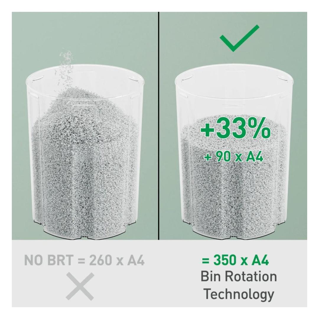 Tänu ainulaadsele Bin Rotation Technology (BRT) süsteemile jaotatakse paberi-osakesed ühtlaselt, suurendades prügikasti mahutavust kuni 33%.