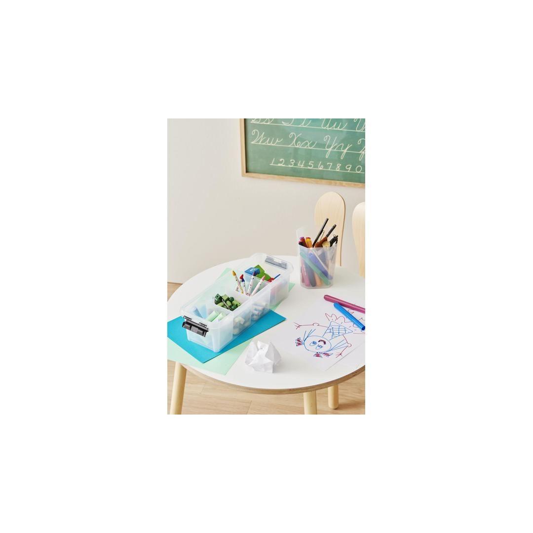 Practical, long storage box with dividers. Ideal for keeping small items such as art and craft supplies, small toys, cosmetics, hair accessories or jewellery organised. Strong clips ensure a tight lid closure. SmartStore boxes are stackable. External dimensions: 38 x 14 x 11 cm Internal dimensions: 32.9 x 10.4 x 9.1 cm Volume: 3.5 l Material: plastic Colour: transparent white