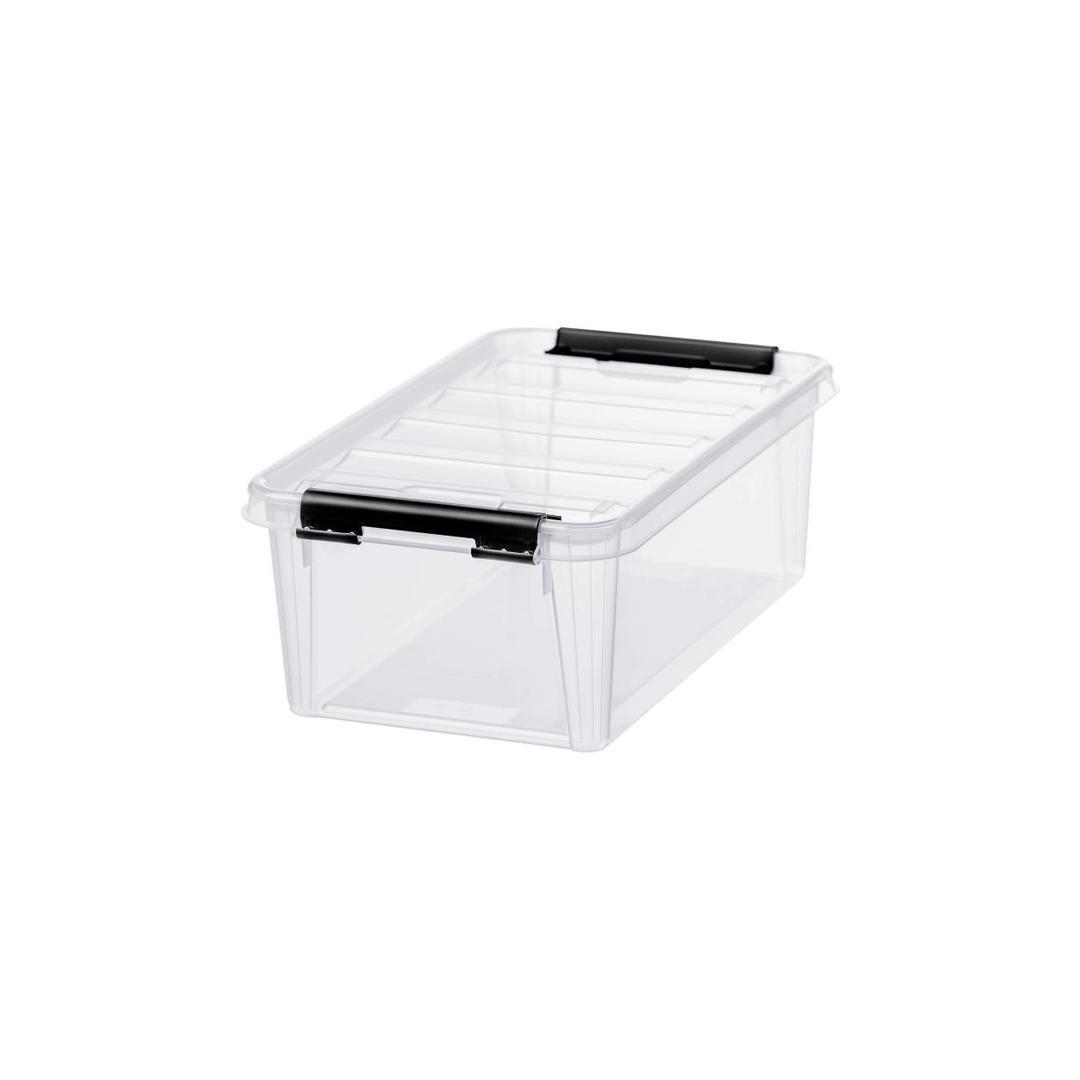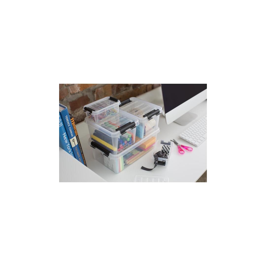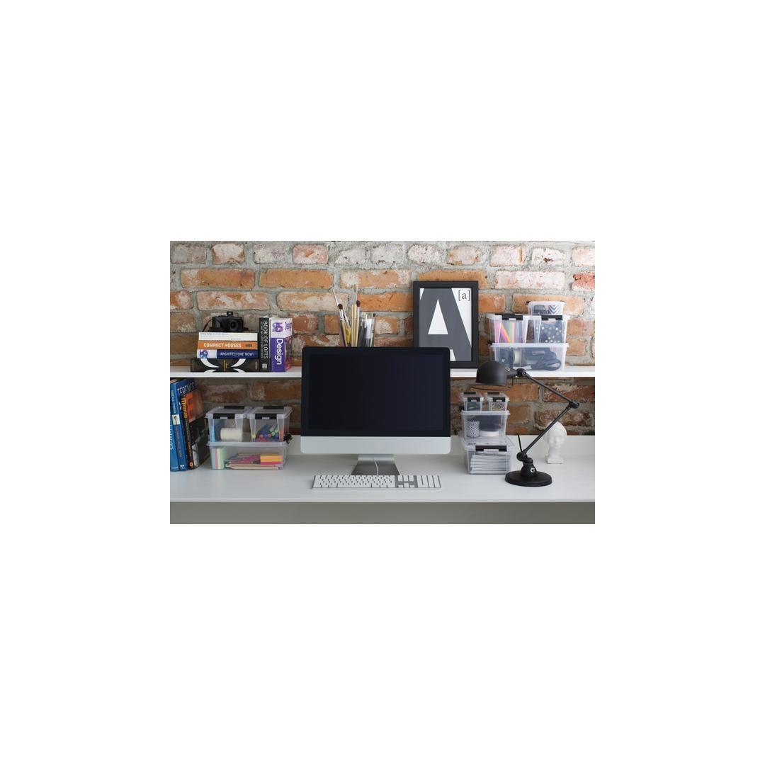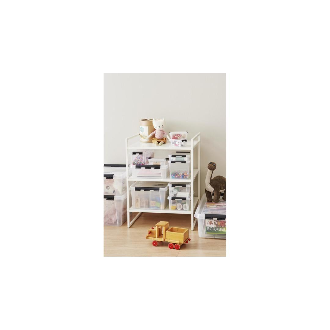 Practical storage box for smaller items. Perfect for storing office supplies, toys, bathroom and cosmetic products, art and craft supplies, etc. Clips keep the lid securely in place. Suitable for storing food. SmartSTore boxes are stackable. External dimensions: 30 x 19 x 11 cm Internal dimensions: 24.9 x 14.7 x 9.1 cm Volume: 3.6 l Material: plastic Colour: transparent white