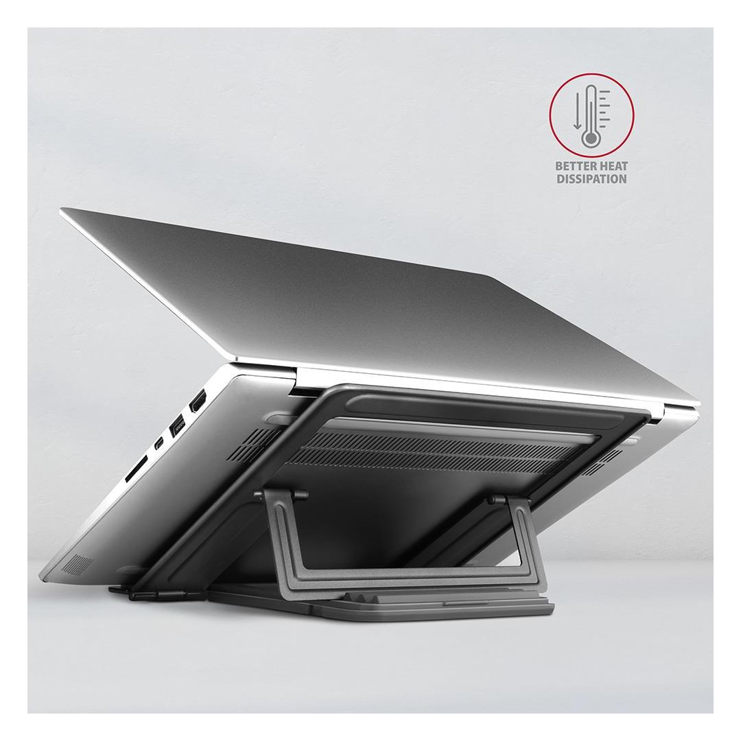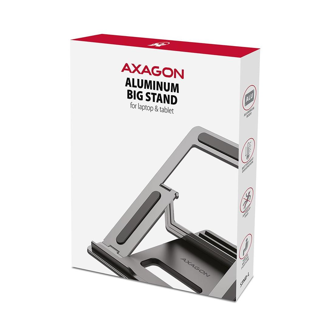AXAGON STND-L is a foldable notebook or tablet stand that relieves your neck and back muscles when working on a computer. The stand has a universal use for devices from 10" up to 16". Four adjustable positions allow for better ergonomics.
