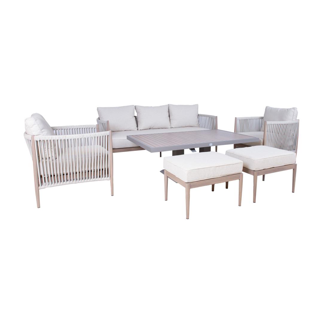 The set includes a table with adjustable height, a 3-seater sofa, 2 armchairs, and 2 ottomans.