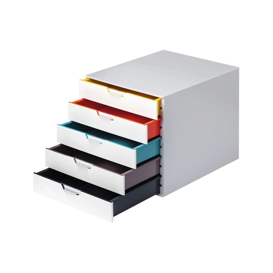 Drawer box in five different colors with drawers: Good for organization and orientation. Drawers move quietly, extension limiter. For formats up to A4, C4, folio and letter paper formats - suitable for storing various documents. Transparent labeling windows for replaceable content sheets. Stackable: With non-slip plastic feet. Fits all standard office cabinets and chests of drawers. 5-year warranty. Technical data: Material: ABS and PS plastic Drawer height: 55 mm Dimensions: 280 x 292 x 356 mm (width x height x depth) Weight: 3.6 kg. Colors: White body and five drawers in different colors