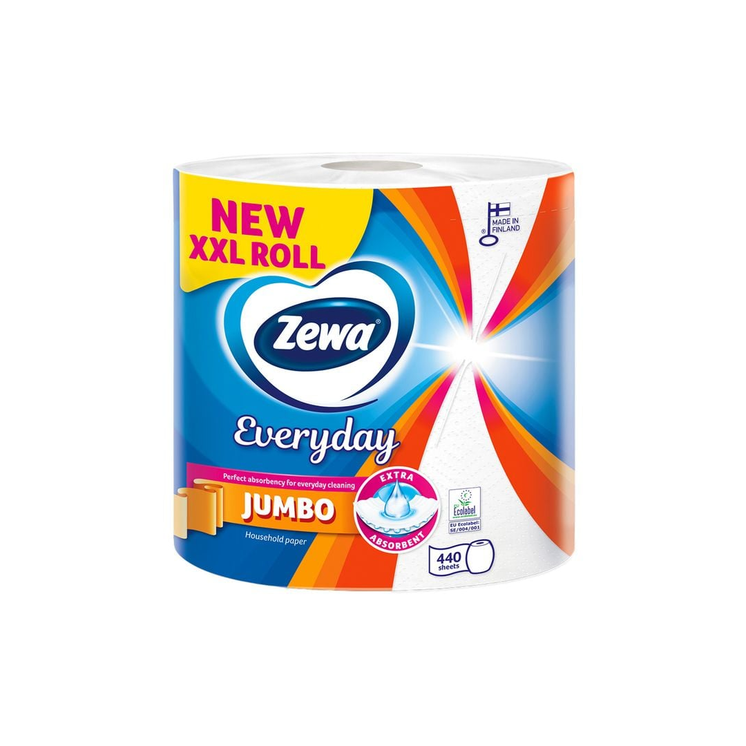 Zewa Everyday Jumbo is designed for everyday use! Its two layers ensure ideal absorbency for everyday use. This XXL roll with 440 sheets will last a long time. Zewa Everyday Jumbo is produced in Finland, in our responsibly operated and high-quality factory. EU Ecolabel FSC certified The packaging is made of 30% recycled plastic and is recyclable.