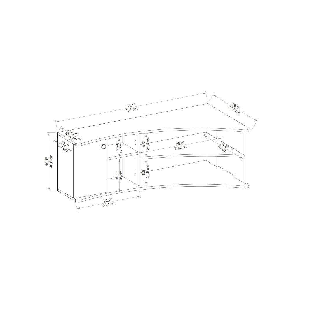 Crafted from 100% melamine coated particle board, this TV stand is built to last. The 18mm thickness ensures stability and durability, while the precise measurements of Height: 48.6 cm, Width: 135 cm, and Depth: 67.7 cm provide ample space for your TV and other media devices. The Atlantic Pine and Anthracite colors add a touch of sophistication to any room, making it a versatile piece that will complement any decor style.