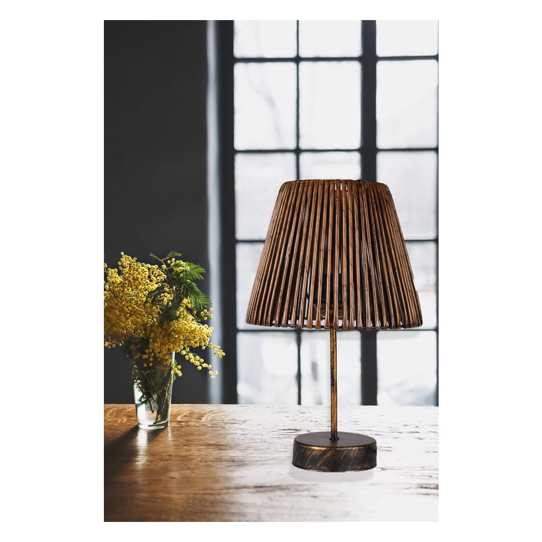 Illuminate your living space with our stunning table lamp, designed to bring warmth and style to any room. The sleek metal base adds a touch of modern elegance, while the imitation bamboo cap adds a natural and earthy element.
