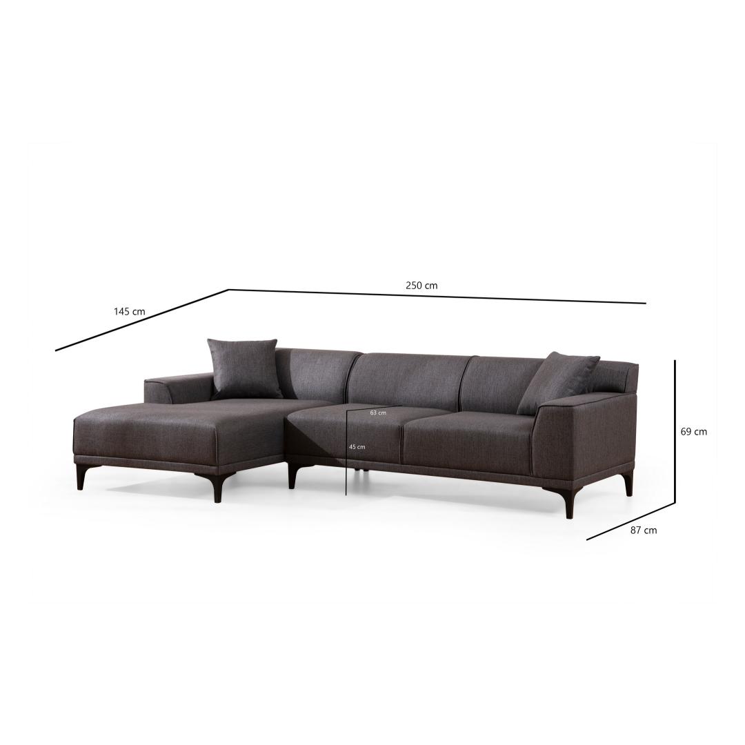 With a width of 145 cm, a length of 250 cm, and a height of 69 cm, this corner sofa provides ample seating space for you and your loved ones. The depth of 87 cm ensures a comfortable lounging experience, allowing you to sink into its plush cushions and relax after a long day.