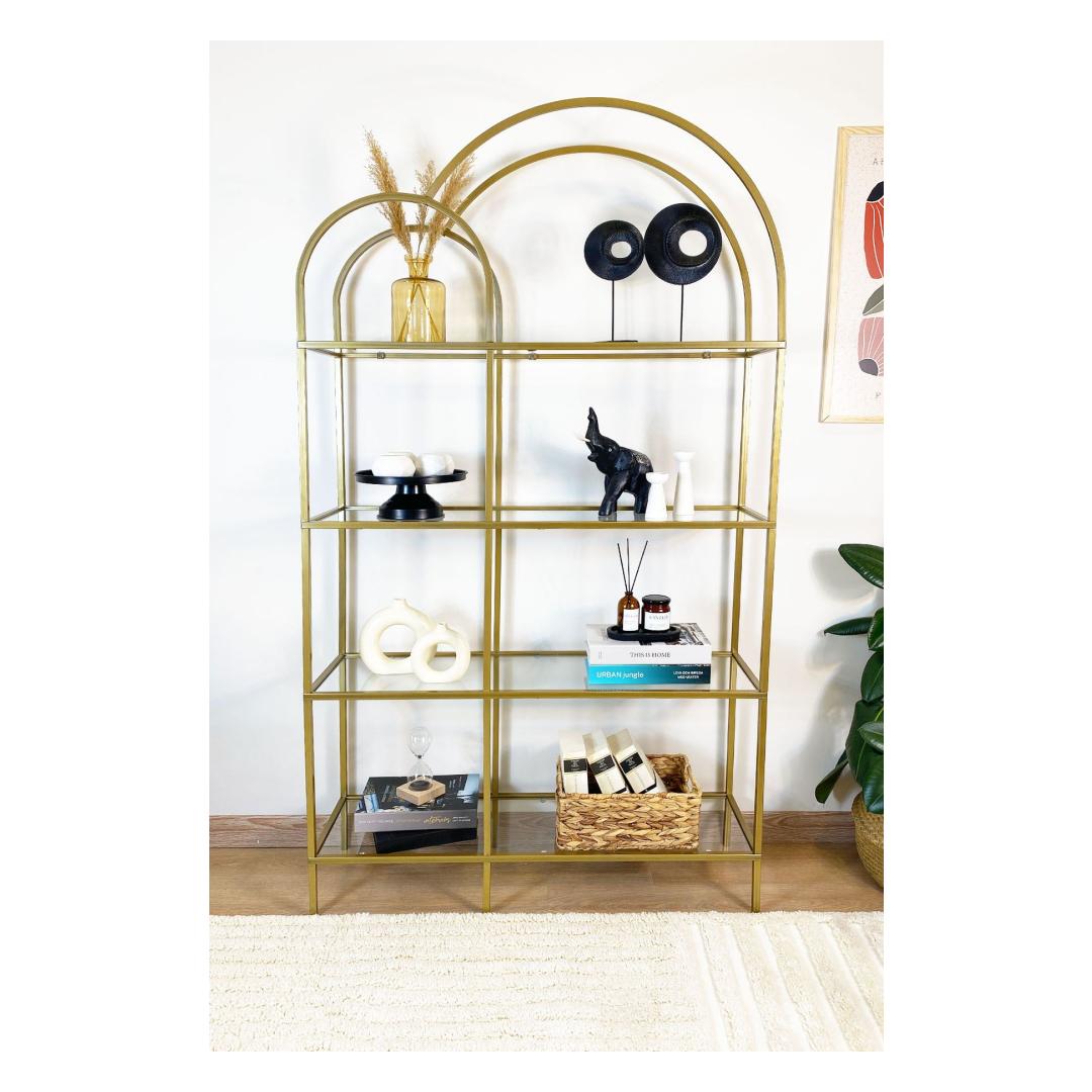 Add a touch of luxury to your home with this sleek and stylish bookshelf. The combination of gold and transparent colors creates a chic and contemporary look that will impress your guests and make a statement in any room.